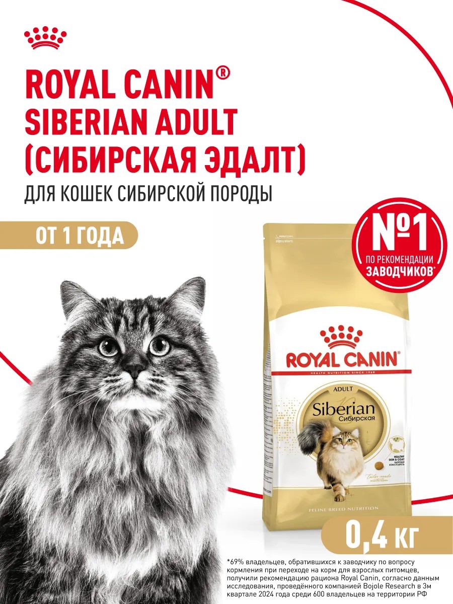 Корм сухой полнорационный сбалансированный для кошек - Специально для взрослых кошек породы Сибирская старше 12 месяцев Siberian Adult (Сибирская Эдалт) Royal Canin, подходящий для кошек сибирской породы в возрасте от 1 года и старше, специально разработан с учетом потребностей вашей кошки в питательных веществах.
