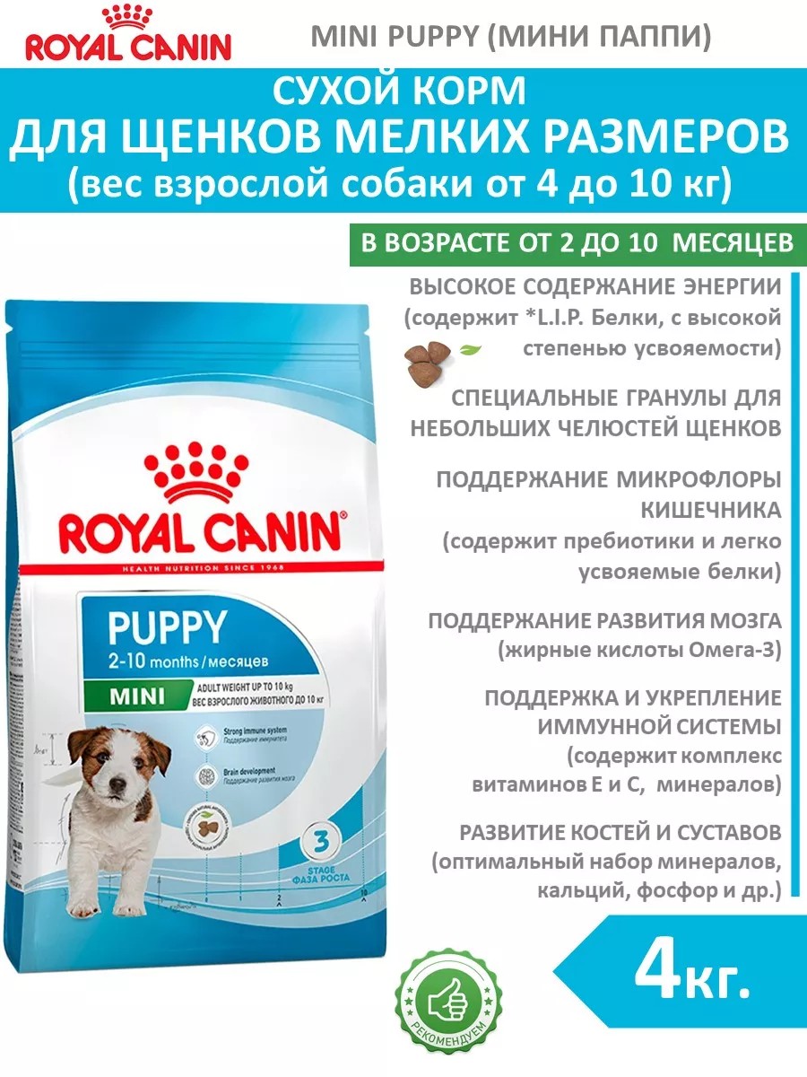 | Комплектация | сухой корм для щенков мелких размеров; 4 кг; 1 шт роял канин мини паппи; мини паппи |