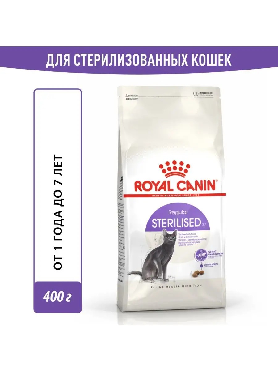 Сухой корм Royal Canin для стерилизованных кошек feline health nutrition sterilised 37 400г Полнорационный сухой корм для кастрированных котов и стерилизованных кошек от 1 до 7 лет. После стерилизации (кастрации) поведение кошек меняется, и их питание должно соответствовать новым специфическим потребностям. Дело в том, что эти кошки не отличаются высокой активностью, потребляют меньше жидкости и, соответственно, у них реже частота мочеиспусканий и повышена концентрация мочи. Ключевые особенности: Контроль веса. После стерилизации у кошек уменьшаются энергетиче