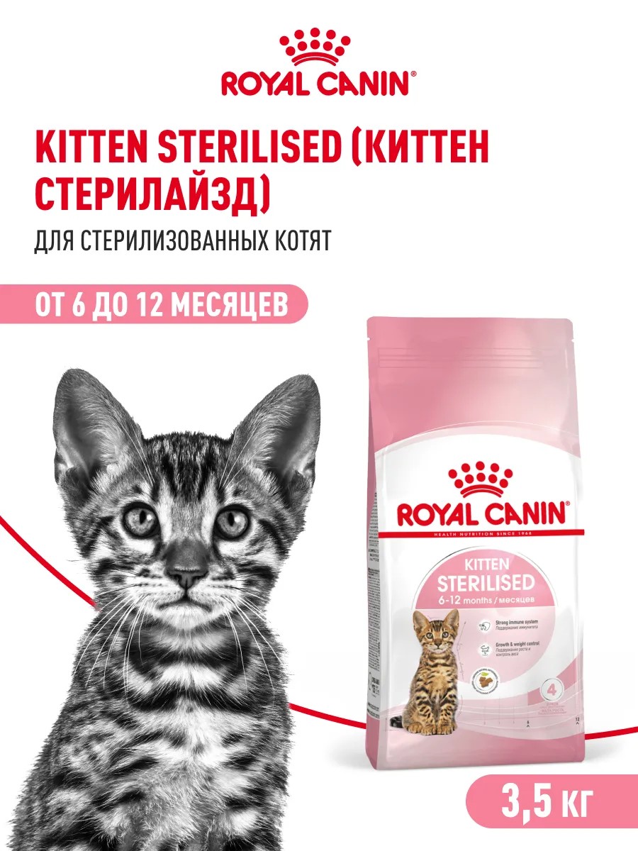 Корм сухой полнорационный сбалансированный для кошек – Специально для стерилизованных котят (в возрасте от 6 до 12 месяцев) Kitten Sterilised 6-12 months (Киттен Стерилайзд) Royal Canin, подходящий для стерилизованных котят в возрасте с момента операции до 12 месяцев, специально разработан c учетом потребностей вашего котенка в питательных веществах.