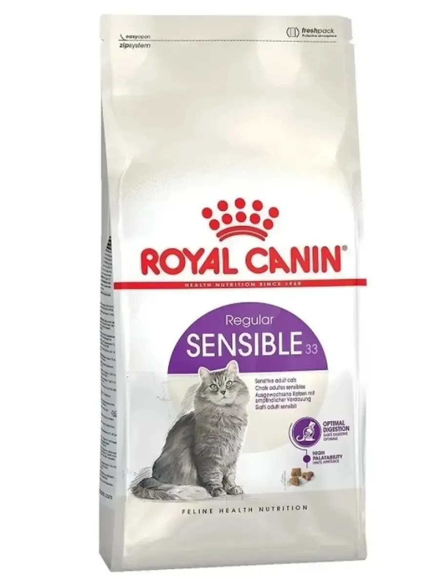Корм сухой Royal Canin Sensible 33 для взрослых кошек, с чувствительным пищеварением, 2 кг. Сенсибл 33: сухой корм для взрослых кошек (в возрасте от 1 года до 7 лет) с повышенной чувствительностью пищеварительной системы. Сочетание крокет трех разных форм и эксклюзивный комплекс ароматов обеспечат привлекательность продукта для кошек с пониженным аппетитом и чувствительной пищеварительной системой.