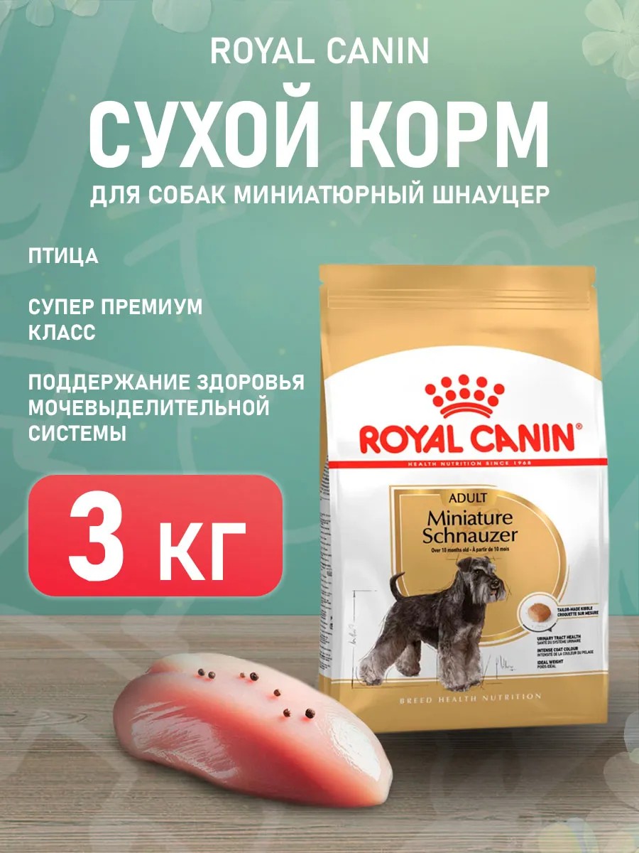 Полнорационный сухой корм для миниатюрных шнауцеров (цвергшнауцеров) в возрасте старше 10 месяцев. Миниатюрные шнауцеры особо предрасположены к образованию почечных камней. Корм для собак Royal Canin Miniature Schnauzer способствует поддержанию здоровья мочевыделительной системы.