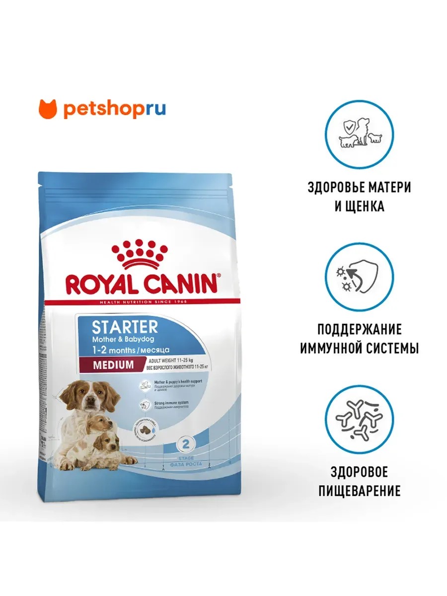 Сухой корм для средних пород ROYAL CANIN Medium Starter Mother&Babydog удовлетворяет энергетические потребности собаки с 42-го дня беременности и в течение всего периода лактации.