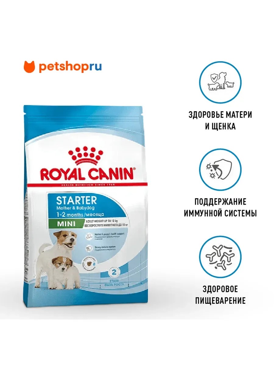 Royal Canin Mini Starter Mother & Babydog food contains all the nutrients required by small breed dogs (adult weight up to 10 kg) during the second half of pregnancy and lactation, as well as their puppies up to 2 months of age during weaning.