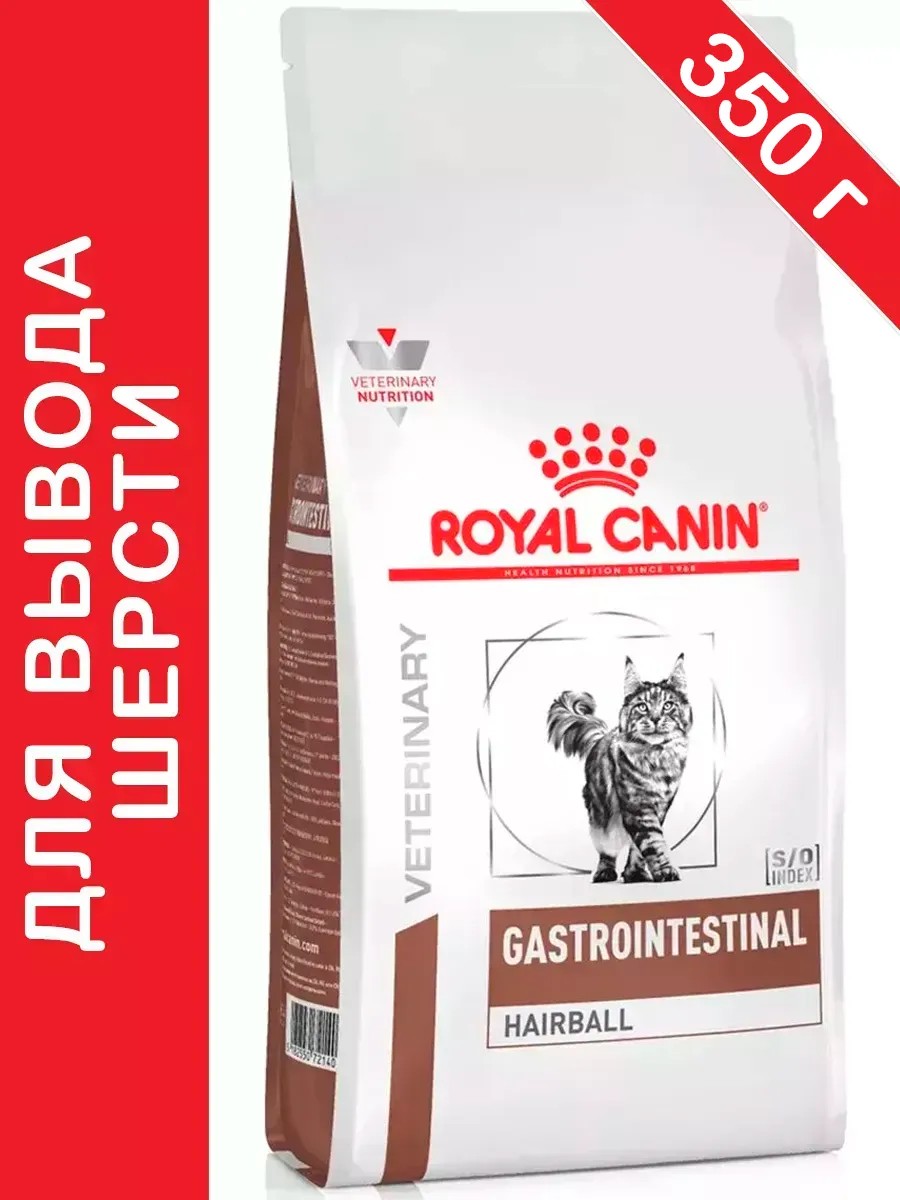 Royal Canin Gastrointestinal Hairball (Гастроинтестинал Хэйрболл) — полнорационный диетический корм для взрослых кошек при нарушениях пищеварения, вызванного наличием волосяных комочков.-способствует выведению проглоченной шерсти и профилактике образования волосяных комочков-способствует поддержанию здорового пищеварения и оптимального качества стула-умеренное содержание энергии в диете помогает контролировать массу телаПоказания:-Рецидивирующие случаи образования волосяных комочков-Заболевания, при которых требуется увеличениесодержания клетчатки в корме.Рекомендация:Решение о продолжительности курса диетотерапии или смене диеты можно принимать только по рекомендации ветеринарного врача.При часто повторяющихся случаях формирования волосяных комочков может быть рекомендовано долгосрочное применение Gastrointestinal Hairball. Если образование волосяных комочков также сопровождается развитием запоров, диета Gastroinrestinal Fibre Response может быть более подходящей.Эта диета способствует созданию в мочевыделительной системе среды, неблагоприятной для формирования как струвитных, так и оксалатных кристаллов.Полезные свойства:-Поддержание здоровья пищеварительной системы-Высокоусвояемая формула, содержащая сбалансированный комплекс разных видов клетчатки, в том числе пребиотики, способствует поддержанию здорового пищеварения и оптимального качества стула.Контроль образования волосяных комочков-Особое сочетание разных видов клетчатки (включая подорожник) способствует выведению проглоченной шерсти и профилактике образования волосяных комочков.Умеренное содержание энергии-Умеренное содержание энергии в диете помогает контролировать массу тела.Рекомендации:Придерживайтесь диетологических рекомендаций вашего ветеринарного врача.