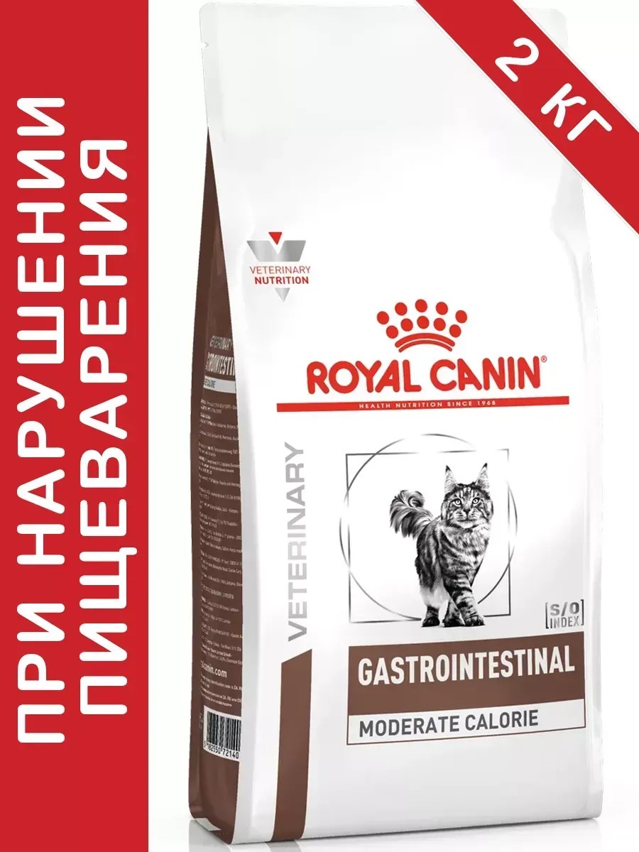Royal Canin Gastrointestinal Moderate Calorie GIM 35 Feline (Гастроинтестинал Модерат Калори (фелин)) — полнорационный диетический корм для кошек, рекомендуемый при острых расстройствах пищеварения и для нормализации работы пищеварительной системы. Легкоусвояемые ингредиенты. Повышенное содержание электролитов. Пониженный уровень жиров. Показания:-Острая и хроническая диарея-Хроническое воспаление кишечника-Плохая переваримость и абсорбция питательных веществ-Пролиферация бактерий в тонком кишечнике-Колит-Гастрит-Панкреатит-Экссудативная энтеропатия Длительность курса применения: Для усиления регенераторной способности ворсинчатого эпителия стенки кишечника при остром воспалительном процессе рекомендуется диетотерапия с минимальным сроком три недели. При хронических заболеваниях может потребоваться назначение диетического корма на протяжении всей жизни животного.Преимущества:-Безопасность пищеварительной системы: Сочетание высокоусвояемых белков (L. I. P. белки), пребиотиков, свекольного жома, риса и рыбьего жира обеспечивает максимальную защиту пищеварительной системы. Умеренное содержание энергии: Умеренное содержание энергии в диете рекомендовано не только при панкреатите, но также помогает контролировать массу тела у кастрированных или склонных к избыточному весу животных. -Повышенная вкусовая привлекательность: При нарушениях пищеварения часто наблюдаются плохой аппетит и потеря веса. Высокая вкусовая привлекательность стимулирует потребление корма и способствует выздоровлению. -EРА / DHA: Длинноцепочечные жирные кислоты Омега 3 (эйкозапентаеновая и докозагексаеновая) уменьшают кожные реакции и обеспечивают целостность слизистой оболочки кишечника.Рекомендации: