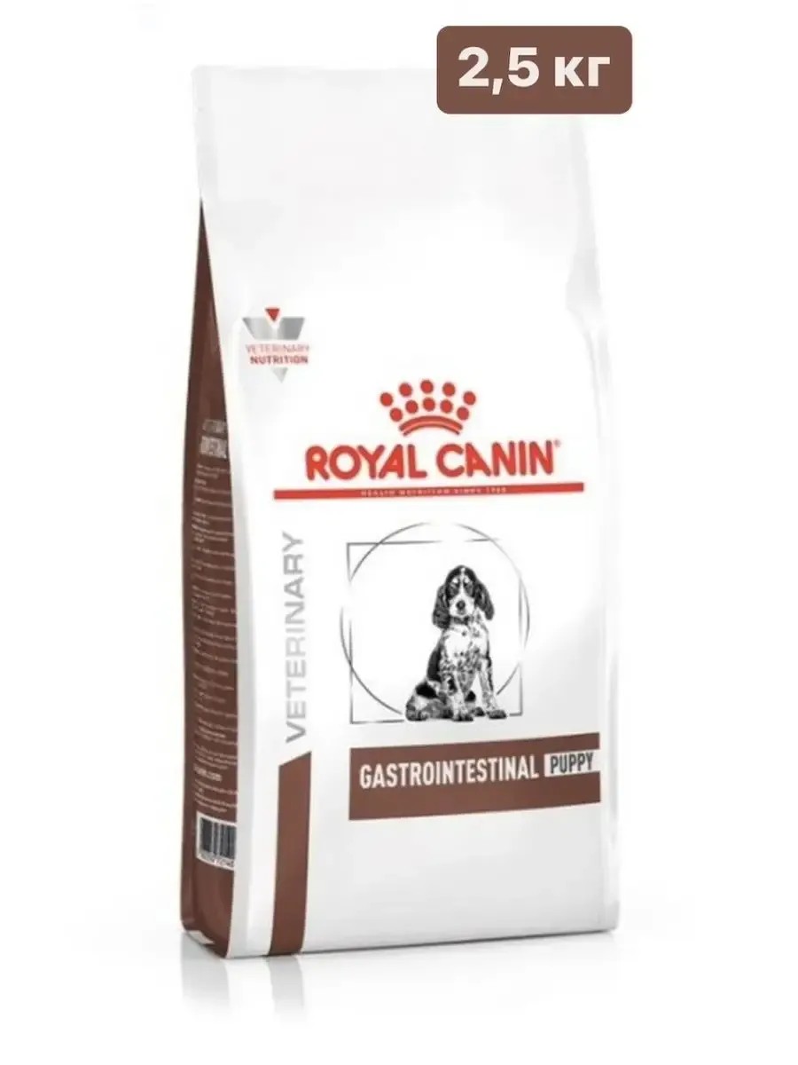 Royal CaninGastrointestinal Puppy Корм сухой полнорационный диетический для щенков до 1 года, рекомендуемый при острых расстройствах пищеварения. Ветеринарная диета. 2,5кг. Корм сухой полнорационный диетический для щенков до 1 года, рекомендуемый при острых расстройствах пищеварения. Ветеринарная диета способствует поддержанию баланса пищеварительной системы щенка высокое содержание энергии отвечает потребностям щенков и позволяет снизить нагрузку на кишечник облегчает кормление щенка за счет высокой гигроскопичности крокеты. Рекомендуется для щенков с момента отъема до достижения взрослого возраста (а также для сук в период беременности/лактации) в случае:Острая и хроническая диарея (включая пост отъемную диарею)Гастрит. Воспалительные заболевания кишечника (ВЗК)Колит. Экзокринная недостаточность поджелудочной железы. Чрезмерный рост бактериальной флоры в тонком кишечнике. Синдром мальдигестии/мальабсорбции. Снижение аппетита, возобновление кормления после операции. Противопоказания:Панкреатит или панкреатит в анамнезе*Гиперлипидемия*Лимфангиэктазия, экссудативная энтеропатия*РЕКОМЕНДАЦИЯ: решение о продолжительности курса диетотерапии или смене диеты можно принимать только по рекомендации ветеринарного врача.Для усиления регенераторной способности ворсинчатого эпителия стенки кишечника при остром воспалительном процессе рекомендуется диетотерапия с минимальным сроком три недели. Для оптимальной работы пищеварительной системы необходимо увеличение кратности кормлений в день и соблюдение рекомендованного суточного рациона.РАЗМАЧИВАНИЕ:- Залейте крокеты в два раза большим объемом горячей воды (20 мл воды на 10 г корма, температура воды 60 С).- Подождите 15-20 минут, чтобы крокеты пропитались водой.- Размешайте вилкой, чтобы придать корму кашицеобразную текстуру.- Охладить до комнатной температуры или температуры тела.*В этих случаях рекомендуется продукт Gastrointestinal Low Fat с внимательным наблюдением.
