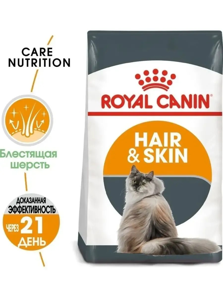 Сухой корм для кошек Royal Canin Hair & Skin Care, для поддержания здоровья кожи и шерсти 2 кг. HAIR & SKIN CARE - тщательно сбалансированная формула, помогающая поддерживать здоровье кожи и шерсти. Продукт содержит: Уникальную комбинацию питательных веществ, в том числе эксклюзивный комплекс аминокислот и витаминов B, для поддержания барьерной функции кожи. Легкоусвояемые белки (L.I.P*), жирные кислоты Омега 3 и 6, известные своим благоприятным воздействием на состояние шерсти и кожи. - L.I.P.: белки, отобранные по принципу максимальной усвояемости (более 90 %), поддерживающие здоровье пищеварительной системы, и в том числе нормализующие стул. Баланс минеральных веществ продукта поддерживает здоровье мочевыводящих путей взрослой кошки.