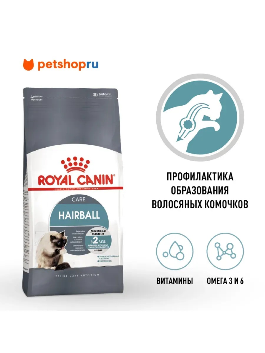 Hairball Care (Хэйрболл кэа): сухой корм для профилактики образования волосяных комочков. Кошки посвящают 30% своего времени уходу за шерстью. До 2/3 выпадающих волосков они при этом проглатывают, что может привести к образованию волосяных комочков в пищеварительном тракте. Адаптированное питание поможет справиться с волосяными комочками и поддержать здоровье пищеварительной системы. Для взрослых кошек, живущих в помещении, в возрасте от 1 до 7 лет, склонных к образованию волосяных комочков.