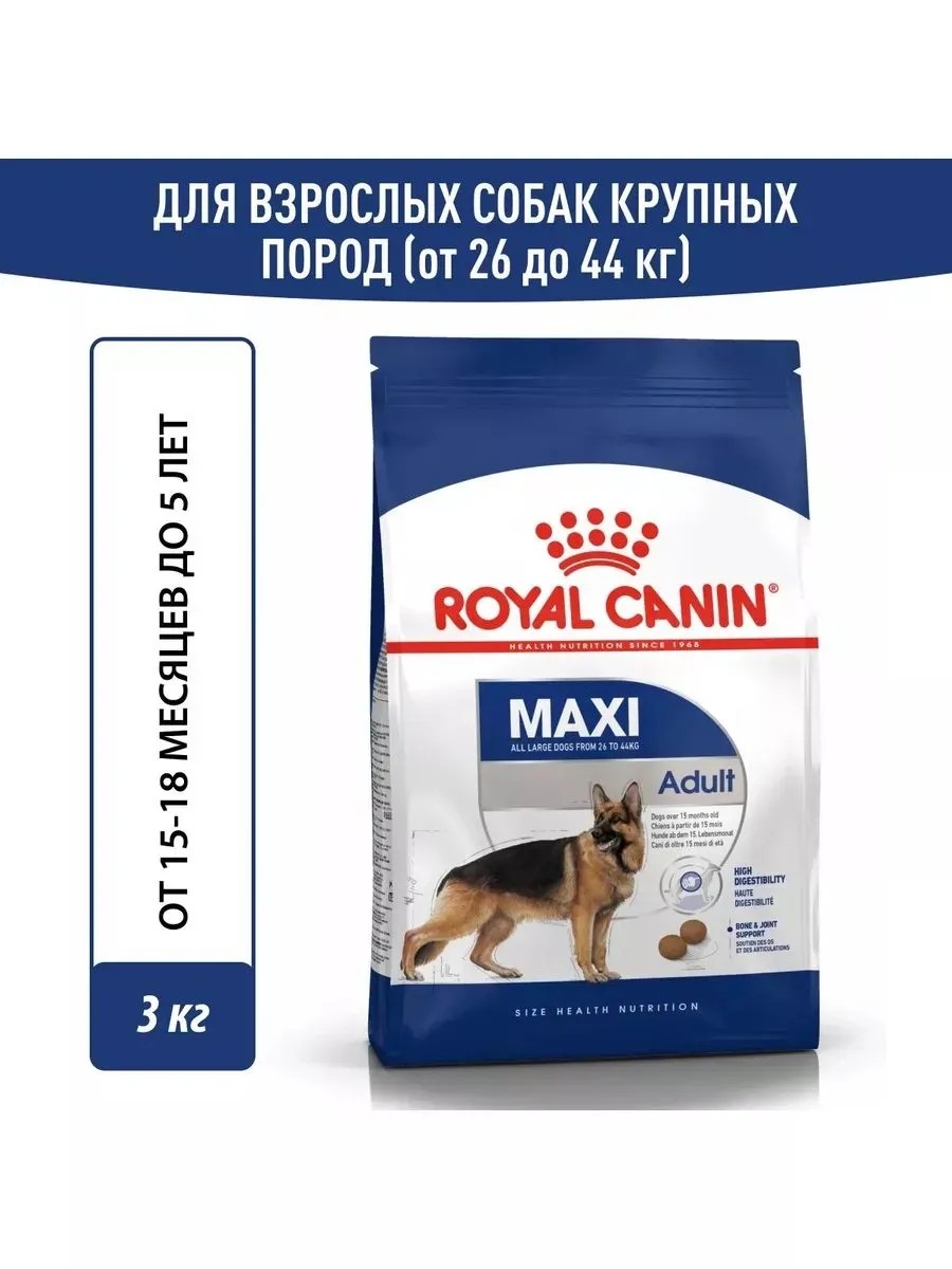 Royal Canin Maxi Adult - это полноценный сухой корм, разработанный специально для взрослых собак крупных пород весом от 26 до 44 кг в возрасте от 15 месяцев до 5 лет.