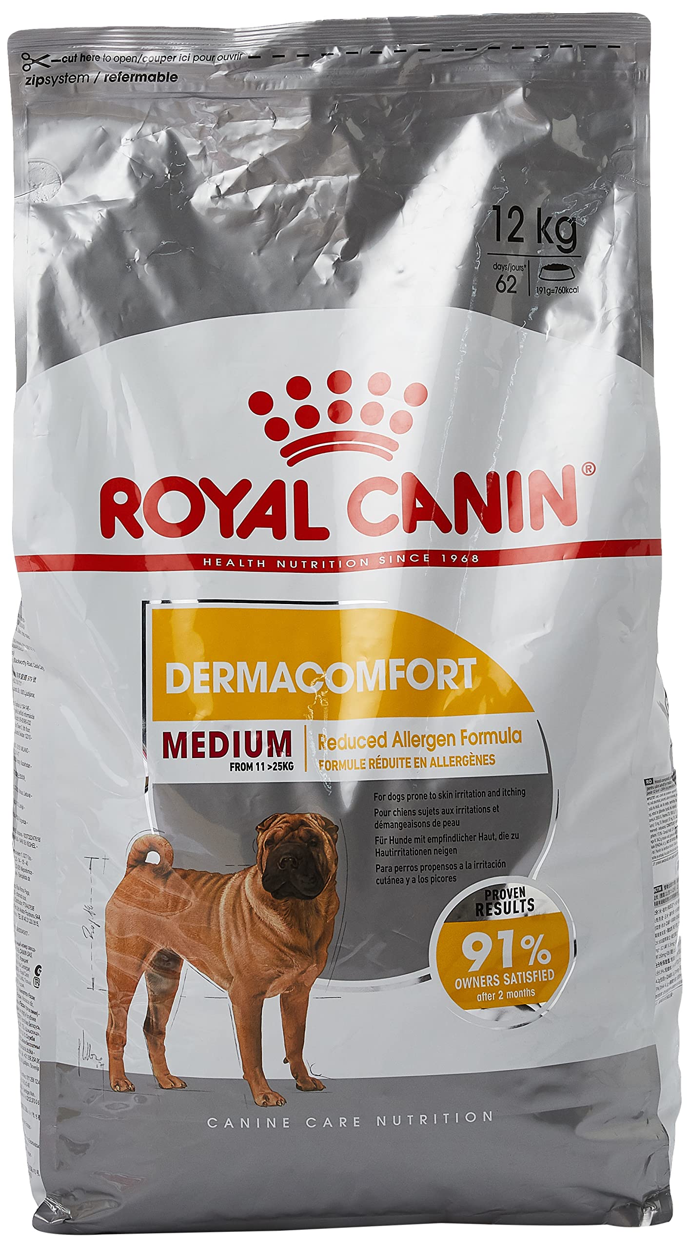 Royal Canin Medium Adult Dermacomfort Dry Dog Food - 10kg INDICATIONS Skin itching and irritation in medium breed adult dogs DIRECTIONS Follow the feeding guidelines based on your dog’s ideal adult bodyweight; consider mixed feeding for dry and wet food. See more