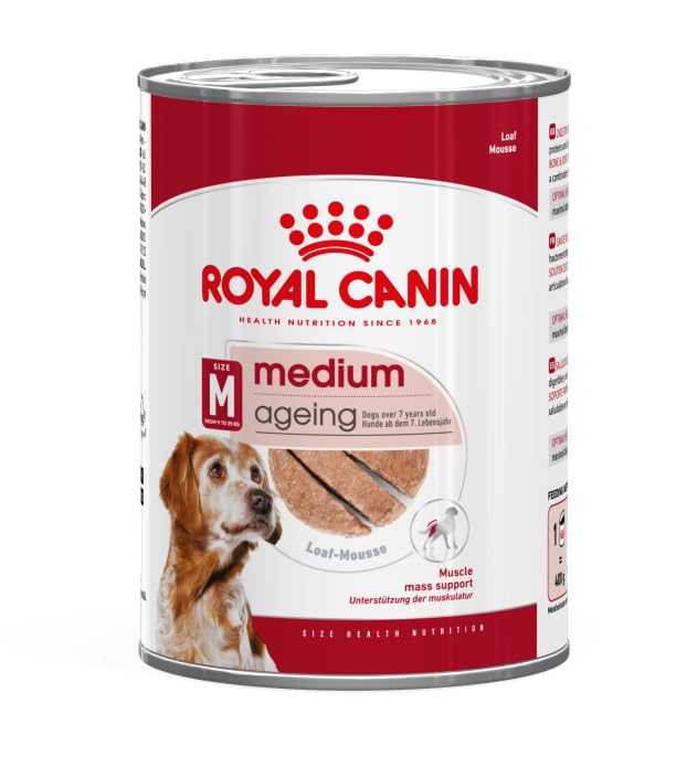 As your dog enters their golden years, they need a size-specific tailored diet that helps support healthy ageing so that they can enjoy their senior years in good health.ROYAL CANIN Medium Ageing Loaf is a nutritionally complete and balanced wet food diet specially designed to meet your medium-sized dogs particular needs and support them throughout their senior years. This diet is suitable for medium-sized dogs that weigh between 11 and 25kg and are over 7 years old.Senior dogs rely on consistent exercise for proper muscle development. With its specialised, high-quality protein content, this food is crafted to help your ageing dog maintain muscle mass. Your senior dogs active lifestyle can expose them to environmental elements that can weaken their immune system. This formula contains prebiotics and a blend of vitamins, including vitamins C and E, to help support their natural defences. This specially crafted formula is enriched with essential vitamins and nutrients like EPA and DHA, to help support lifelong vitality and enjoy their senior years in good health. No matter what breed your dog is, their coat is their crowning glory. Enriched with a blend of nutrients, this food helps keep your senior dogs skin healthy and their coat glossy and gorgeous.ROYAL CANIN Medium Ageing Loaf is also available in a dry kibble: ROYAL CANIN Medium Ageing 10+. Your dogs sensory capacity can decrease as they get older, so mixing wet and dry food can help to enhance the palatability of their meal. Dry kibble creates a mechanical brushing effect to help maintain dental health, while the moisture content in wet food helps to keep your dog hydrated and maintain their urinary health. All ROYAL CANIN products undergo an extensive quality control process to guarantee the best quality food, and theyre packaged under a protective atmosphere to preserve freshness and nutritional quality for longer. Our team of scientists create formulas tailored to your senior dogs specific nutritional needs, using high-quality nutrients and keeping sustainability in mind. INDICATIONS Senior INGREDIENTS COMPOSITION: meat and animal derivatives, cereals, oils and fats, derivatives of vegetable origin, minerals, yeasts. DIRECTIONS Use as directed See more