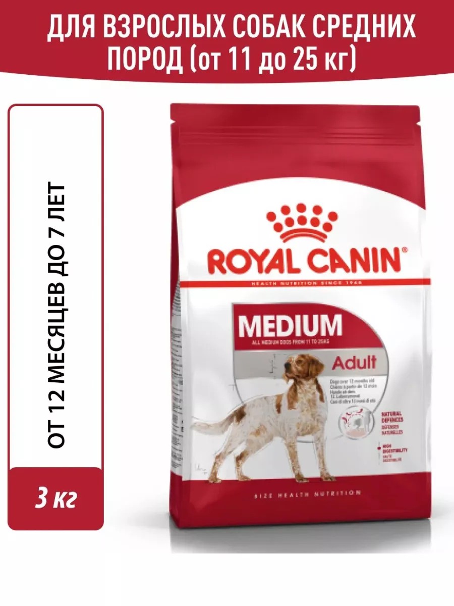 ROYAL CANIN Medium Adult (Медиум Эдалт) - это корм, созданный специально для взрослых собак средних пород в возрасте от 12 месяцев до 7 лет. Этот продукт обеспечивает вашего пушистого друга всеми необходимыми питательными веществами для активной и здоровой жизни. Одной из ключевых особенностей этого корма является его уникальный комплекс антиоксидантов и других важных питательных веществ. Он поддерживает иммунитет вашей собаки, помогая ей оставаться здоровой и энергичной. Ведь вашей собаке важно иметь достаточно энергии для активной жизни. Кроме того, содержит высококачественный белок, который способствует оптимальному пищеварению. Это помогает вашей собаке эффективно усваивать все необходимые питательные вещества, поддерживая ее в хорошей форме. Оптимальное количество пищевой клетчатки в корме обеспечивает нормальную работу пищеварительной системы, поддерживая здоровье вашей собаки. Для того чтобы кожа вашего питомца оставалась здоровой, а шерсть блестящей, ROYAL CANIN Medium Adult (Медиум Эдалт) обогащен жирными кислотами Омега-3 (ЭПК и ДГК). Эти жирные кислоты поддерживают здоровье кожи и красоту шерсти, делая вашего пушистого друга еще привлекательнее. Поэтому, если у вас есть собака средних пород - это забота и здоровье в каждой порции.