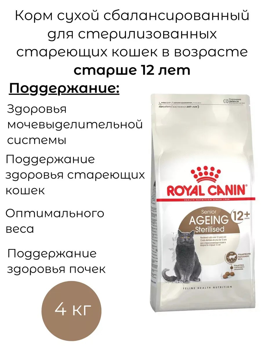 Корм сухой полнорационный для кошек - Специально для стерилизованных кошек в возрасте старше 12 лет AGEING STERILISED 12+ (ЭЙДЖИНГ СТЕРИЛАЙЗД 12+) ROYAL CANIN, подходящий для стерилизованных кошек в возрасте старше 12 лет, специально разработан с учетом потребностей вашей кошки в питательных веществах.
