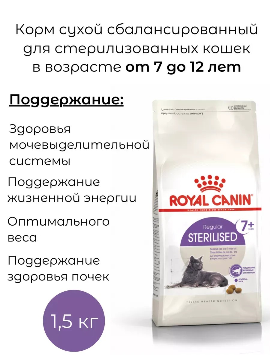 Корм сухой полнорационный для кошек - Специально для стерилизованных кошек в возрасте от 7 до 12 лет STERILISED 7+ (СТЕРИЛАЙЗД 7+) ROYAL CANIN, подходящий для стерилизованных кошек в возрасте от 7 до 12 лет, специально разработан с учетом потребностей вашей кошки в питательных веществах.