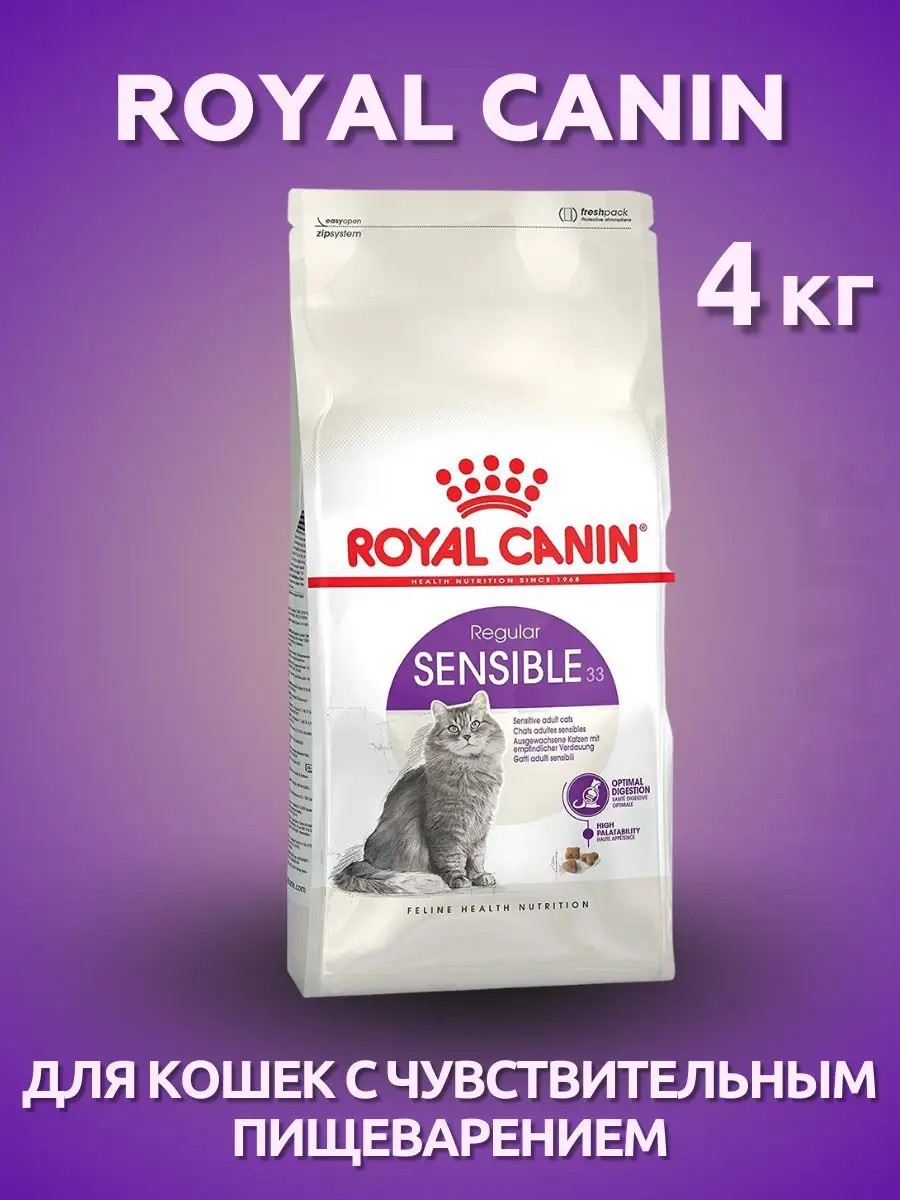 Royal Canin Sensible Royal Canin Sensible 33 (Sensitive Digestion) is dry food for adult cats (aged 1 to 7 years) with a highly sensitive digestive system. A combination of three different kibble shapes and an exclusive complex of flavors make this product attractive to cats with a reduced appetite and a sensitive digestive system. Royal Canin Sensible promotes digestive health. Royal Canin Sensible 33 maintains a balance of intestinal microflora. Royal Canin has a highly palatable flavor. Royal Canin dry food for cats of all breeds offers 100% complete and balanced nutrition. Some cats have digestive sensitivities to certain types of food. If your cat has digestive issues, you may need to review its diet. ROYAL CANIN Sensible 33 is designed for adult cats aged 1–7 years with sensitive digestive systems. It contains a unique combination of nutrients to ensure optimal digestive function and prebiotics to maintain intestinal microflora balance. ROYAL CANIN Sensible 33 is highly palatable and consists of kibble in three different shapes. Carefully selected flavors stimulate cats' appetites and facilitate digestion. Additionally, ROYAL CANIN Sensible 33 supports urinary health in adult cats.