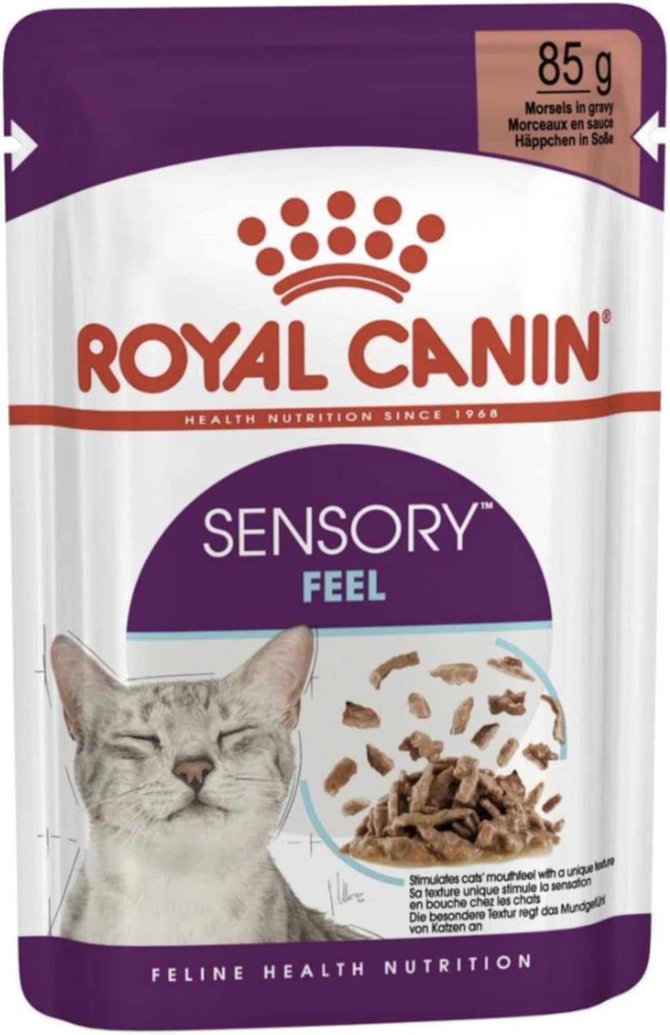 Cats are highly sensory creatures that rely on their senses when it comes to choosing and accepting food. For cats, eating is a tactile event, and different textures have a strong influence over the entire feeding experience. Royal Canin Sensory Feel is specially crafted with unique textures to stimulate your cat’s senses and formulated to support optimal health and wellbeing through sensorial variation. Your cat’s wellbeing is enhanced when their diet is not only nutritious, but sensorially varied too. Royal Canin Sensory Feel is a highly attractive formula with a unique texture designed to stimulate your cat’s refined senses through mouthfeel (the sensation that food stimulates). Royal Canin Sensory Feel Adult Wet Cat Food (in Gravy) 12x85g Pouches is specifically designed to match the optimal Macro-Nutrient profile that is instinctively preferred by adult cats. This formula also contains a combination of nutrients that help support the health of your adult cat’s urinary system. Thanks to Royal Canin's innovative manufacturing technology, Sensory Feel’s mix of meaty chunks in gravy feature physical properties that provide textural sensations to both surprise and stimulate your cat’s senses, turning your cat’s feeding ritual into a sensorially-rich experience. Key benefits: Stimulates cats’ distinctive sense of taste Cats’ well-being is enhanced when their diet provides sensorial variation – Royal Canin Sensory stimulated cats’ senses and enhances their feeding experience. Mixed feeding both wet and dry food gives your cat a variety of textures, helping to stimulate their appetite even more. A diet that is a mixture of wet and dry food is also a good option for fussy eaters. Be sure to follow the correct rationing amount to ensure healthy portions. The Sensory wet range can be integrated into the mixed feeding routine of all our Feline Health Nutrition Adult dry products. Ingredients: Meat and animal derivatives, cereals, fish and fish derivatives, vegetable protein extracts, minerals, derivatives of vegetable origin, oils and fats, various sugars. Nutritional information: Crude ash: 1.5%. Crude fibre: 0.5%. Crude oil fats: 2.8%. Moisture: 79.6%. Protein: 10.5%. Suitable for: Adult cats over 12 months old. Stimulates cats’ refined sense of unique textures. To cater to each cat’s individual preferences, Royal Canin Sensory Feel is also available with morsels in jelly for optimal texture variety. Other products in the Royal Canin Sensory range include Sensory Taste and Sensory Smell, each with its own attractive formula to stimulate your cat’s appetite and create a sensorially rich feeding experience. Royal Canin is committed to providing nutritional solutions to your pet’s needs. All products undergo an extensive quality control process in order to guarantee the optimum quality of food as well as catering to your cat’s specific dietary requirements and lifestyle. This means that when your cat eats Royal Canin Sensory Feel Adult Wet Cat Food (in Gravy) 12x85g Pouches they’re getting a complete and balanced diet. INGREDIENTS As per listing DIRECTIONS Use as required See more