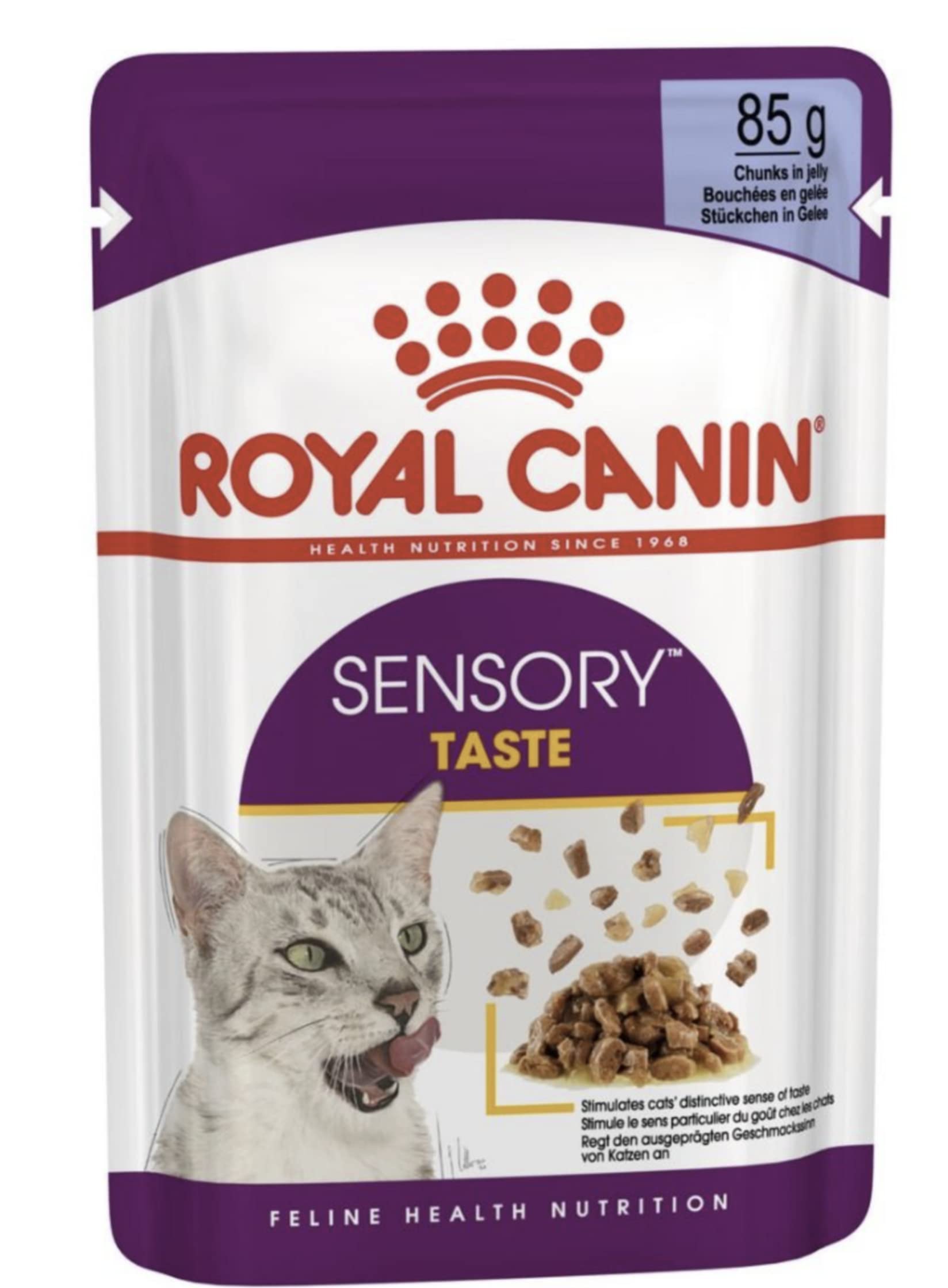 Although cats have very few taste buds meaning their sense of taste isn’t the strongest, it is still uniquely specialised. Due to their carnivorous predisposition, cats are sensitive to the meaty flavours associated with savouriness; so even though their taste range is smaller, they still have a perceptive sensitivity to taste. Your cat’s health and wellbeing is enhanced when their diet is not only nutritious, but sensorially varied too. Royal Canin Sensory Taste formulas are crafted with powerful flavours characterised by toasted, meaty, and caramelised traces that stimulate your cat’s unique sense of taste, turning their feeding ritual into a sensorially-rich experience. Royal Canin Sensory Taste Adult Wet Cat Food (in Jelly) is specifically designed to match the optimal Macro-Nutrient profile that is instinctively preferred by adult cats. This formula also contains a combination of nutrients that help support the health of your adult cat’s urinary system. Key benefits: Stimulates cats’ distinctive sense of taste Cats’ well-being is enhanced when their diet provides sensorial variation – Royal Canin Sensory stimulated cats’ senses and enhances their feeding experience. Mixed feeding both wet and dry food gives your cat a variety of textures, helping to stimulate their appetite even more. A diet that is a mixture of wet and dry food is also a good option for fussy eaters. Be sure to follow the correct rationing amount to ensure healthy portions. The Sensory wet range can be integrated into the mixed feeding routine of all our Feline Health Nutrition Adult dry products. Ingredients: Meat and animal derivatives, vegetable protein extracts, minerals, derivatives of vegetable origin, yeasts, various sugars. Nutritional information: Crude ash: 1.8%. Crude fibre: 0.5%. Crude oil fats: 4.5%. Moisture: 80.2%. Protein: 11%. Suitable for: Adult cats over 12 months old. Stimulates cats’ distinctive sense of taste. To cater to each cat’s individual preferences, Royal Canin Sensory Taste is also available with morsels in gravy for optimal texture variety. Other products in the Royal Canin Sensory range include Sensory Smell and Sensory Feel, each with its own attractive formula to stimulate your cat’s appetite and create a sensorially rich feeding experience. Royal Canin is committed to providing nutritional solutions to your pet’s needs. All products undergo an extensive quality control process in order to guarantee the optimum quality of food as well as catering to your cat’s specific dietary requirements and lifestyle. This means that when your cat eats Royal Canin Sensory Taste Adult Wet Cat Food (in Jelly) they’re getting a complete and balanced diet. INDICATIONS Adult DIRECTIONS Integrate Royal Canin Sensory Taste Adult Wet Cat Food (in Jelly) pouches with Royal Canin's Feline Health Nutrition Adult dry cat food products, store in a cool and dry place, and use after opening. See more