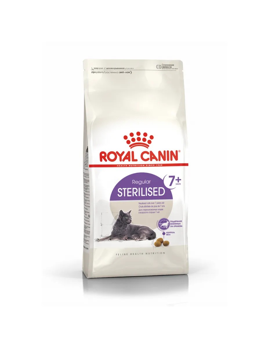 Сухой полнорационный корм Royal Canin Sterilesed 7+ разработанный специально для кастрированных и стерилизованных кошек в возрасте от 7 года до 12 лет.Рацион Роял Канин ROYAL CANIN Sterilised 7+ (Стерилайзд+7) учитывает особые потребности этих кошек и помогает: справиться с первыми признаками старения; поддерживать оптимальный вес кастрированных и стерилизованных кошек; поддерживать здоровье мочевыделительной системы; Рояль Канин стерил - 100% полнорационное и сбалансированное питание.Полноценный и сбалансированный рацион необходим кошке в любом возрасте, однако есть питательные вещества, особенно важные для поддержания здоровья стерилизованных кошек в определенный период жизни.Обогащен полифенолами зеленого чая, витамином C, Омега-3 кислотами ЭПК и ДГК, которые помогают поддерживать здоровье кошек на первом этапе старения.Умеренное содержание жиров ROYAL CANIN Sterilised 7+ (Стерилайзд+7) и L-карнитин помогают снизить риск набора избыточного веса при соблюдении рекомендуемых норм кормления.Благодаря адаптированному содержанию фосфора рацион ROYAL CANIN Sterilised 7+ способствует поддержанию функции почек и здоровья мочевыделительной системы. Для удовлетворения индивидуальных предпочтений каждого питомца к рациону ROYAL CANIN Sterilised 7+ (Стерилайзд+7). Вы можете подобрать влажный рацион в виде кусочков в соусе или других текстур.Выбрав для своей кошки смешанное питание, следуйте рекомендованным нормам кормления, чтобы сочетать сухой и влажный продукт в пропорциях, оптимальных для её здоровья.