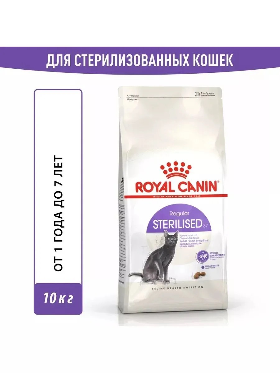 Royal Canin Sterilised 37 - это полнорационный сухой корм, специально разработанный для кастрированных котов и стерилизованных кошек в возрасте от 1 до 7 лет. После стерилизации у кошек меняются потребности организма, и этот корм учитывает все особенности их нового образа жизни.