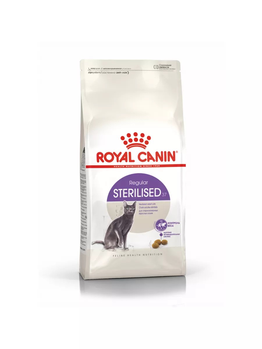 Complete dry food for neutered male and female cats aged 1 to 7 years. After sterilization (castration), cats' behavior changes, and their nutrition must meet their new specific needs. These cats are less active, consume less fluid, and consequently urinate less frequently and have a more concentrated urine. Key features: Weight management. After sterilization, cats' energy needs decrease. STERILISED 37 helps reduce the risk of excess weight thanks to its moderate fat content, when following the recommended feeding guidelines. Urinary tract health: Helps maintain urinary tract health thanks to a balanced mineral balance. Muscle mass maintenance thanks to its high protein content. Helps maintain muscle mass thanks to its high protein content. Enriched with L-carnitine. L-carnitine is essential for normal fat metabolism. FELINE HEALTH NUTRITION is a range of everyday nutrition products for healthy cats, taking into account their needs due to age, lifestyle and other individual characteristics. Ingredients: Dehydrated animal proteins (poultry), vegetable protein isolate*, wheat, cereal flour, vegetable fiber, animal fats, hydrolyzed animal proteins (flavoring additives), rice, minerals, fish oil, yeast and fermentation by-products, soybean oil, fructooligosaccharides, ammonium chloride.