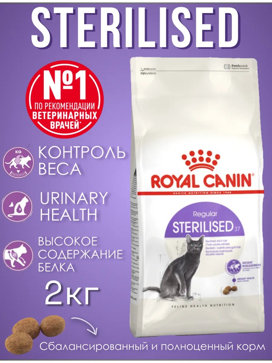 Корм сухой премиум класс Royal Canin Sterilised полнорационный сбалансированный для стерилизованных кошек в возрасте от 1 года до 7 лет, 2кг. После кастрации вашей кошки может потребоваться изменение рациона питания, чтобы гарантировать, что потребляемые ею питательные вещества удовлетворяют ее несколько изменившиеся потребности в энергии и калориях. Корм для кошек сухой Роял Канин Стерилайзд содержит умеренное количество жира при достаточном ежедневном рационе - это помогает питомцу поддерживать идеальный вес и снизить риск снизить риск ожирения и избыточного веса после стерилизации. После кастрации у котов повышенный риск формирования мочевых камней, струвитов, поэтому Sterilized также содержит Urinary Health (Уринари) баланс минералов, которые помогают поддерживать здоровье мочевыделительной системы вашей кошки, предотвратить МКБ, в то время как повышенное содержание белка в этом корме помогает поддерживать здоровую мышечную массу вашей кошки. Содержит L-карнитин. Чтобы удовлетворить индивидуальные предпочтения каждой кошки, Роялканин также доступен в виде влажного корма с вкусной подливкой в соусе или сочным желе. Если вы планируете смешанное кормление, просто следуйте нашим рекомендациям по кормлению, чтобы ваша кошка получала точное количество как влажного в паучах, так и сухого корма с оптимальной пользой. Имеет вкусный и ароматный состав с курицей, что делает еду более привлекательной даже для самых привередливых. 2кг - удобная упаковка с зип застежкой для сохранения свежести. Адаптивные и удобные формы гранул и крокет. Подходитдля всех пород: мейн-кун, сиамская, шотландская вислоухая, абиссинская, британская короткошерстная, бенгальская, тайская, сфинкс, персидская кошка.