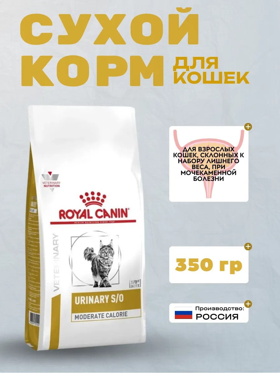 Корм сухой полнорационный диетический для взрослых кошек URINARY S/O MODERATE CALORIE (УРИНАРИ С/О МОДЕРЕЙТ КЭЛОРИ) Корм сухой полнорационный диетический для взрослых кошек предрасположенных к набору лишнего веса, способствующий растворению струвитных камней и предотвращению их повторного образования. Ветеринарная диета.способствует растворению всех типов струвитных камнейпомогает контролировать массу тела кошкиПоказания:Струвитные уролиты: растворение и профилактика рецидивовУролиты оксалата кальция: профилактика рецидивовПротивопоказания:Хроническая болезнь почек (ХБП)Сердечная недостаточность (с ограничением натрия в диете)Применение лекарственных препаратов, способствующих подкислению мочиБеременность, лактация, ростUrinary S/O Moderate Calorie – полноценный диетический корм для кошек, способствующий растворению струвитных камней и профилактике их рецидивов благодаря подкисляющим мочу свойствам и низкому содержанию магния.РЕКОМЕНДАЦИИ. Перед началом диетотерапии проконсультируйтесь с ветеринарным врачом. Струвитные камни растворяются при применении диеты Urinary S/O Moderate Calorie в течение 5–12 недель. Для предупреждения рецидивов уролитиаза курс лечения следует продолжать еще не менее 6 месяцев. По истечении этого времени необходимо повторное общее обследование, чтобы определить целесообразность диетотерапии на протяжении всей жизни кошки. Убедитесь, что кошке всегда доступна чистая свежая вода.