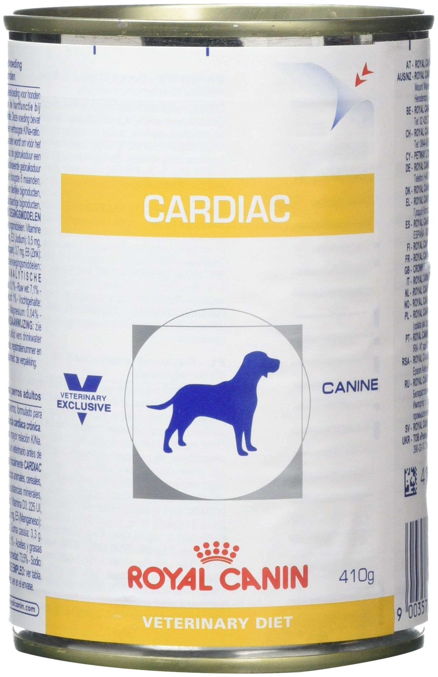 CARDIAC is a complete dietetic feed for dogs formulated to support heart function in the case of chronic cardiac insufficiency. This diet contains a low level of sodium and an increased K/Na ratio INDICATIONS heart INGREDIENTS COMPOSITION: meat and animal derivatives, cereals, oils and fats, derivatives of vegetable origin, minerals, vegetables. ADDITIVES (per kg): Nutritional additives: Vitamin D3: 225 IU, E1 (Iron): 12 mg, E2 (Iodine): 0.5 mg, E4 (Copper): 3.5 mg, E5 (Manganese): 3.7 mg, E6 (Zinc): 37 mg - Technological additives: Cassia gum: 3.3 g. ANALYTICAL CONSTITUENTS: Protein: 8.1% - Fat content: 7.1% - Crude ash: 1.3% - Crude fibres: 1% - Moisture: 73.5% - Sodium: 0.05% - Magnesium: 0.04% - Potassium: 0.23%. DIRECTIONS Only to be used under the direction and/or supervision of a veterinarian. LEGAL DISCLAIMER By purchg this product, you confirm that your pet has been examined by a vet who has recommended the use of this product on the basis of examination and diagnosis. You understand it is recommended that while your pet is using this product, you seek veterinary advice at least every 6 months regarding the usage of this product and the on-going care of your pet. Should your pet's condition deteriorate in any way while using this product it is recommended that you seek immediate veterinary advice. BOX CONTAINS Each order comes with 12 x Royal Canin Veterinary Diet Canine Cardiac Adult Dog Wet Food Tins 410g See more