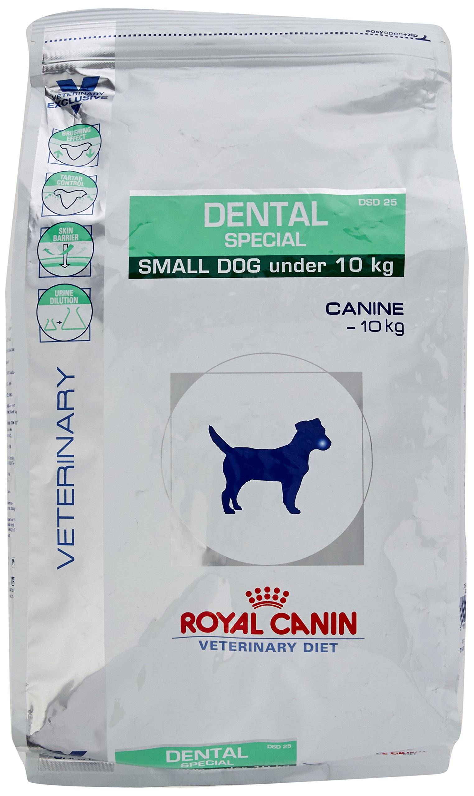 Complete feed for adult dogs - For small breed dogs (weight between 1 and 10 kg) with oral sensitivity INDICATIONS Small breed adult dogs with oral sensitivity and need for tartar control INGREDIENTS COMPOSITION: rice, maize, dehydrated poultry meat, animal fats, maize gluten, wheat gluten*, vegetable fibres, beet pulp, hydrolysed animal proteins, minerals, fish oil, soya oil, fructo-oligo-saccharides, green tea extracts (source of polyphenols), marigold extract (source of lutein). ADDITIVES (per kg): Nutritional additives: Vitamin A: 27300 IU, Vitamin D3: 1000 IU, E1 (Iron): 41 mg, E2 (Iodine): 2.8 mg, E4 (Copper): 9 mg, E5 (Manganese): 54 mg, E6 (Zinc): 203 mg, E8 (Selenium): 0.1 mg - Technological additives: Pentasodium triphosphate: 3 g - Preservatives - Antioxidants. ANALYTICAL CONSTITUENTS: Protein: 25% - Fat content: 16% - Crude ash: 5.4% - Crude fibres: 4.5%. *L.I.P.: protein selected for its very high assimilation. DIRECTIONS A careful and gradual dietary change over 7-10 days is recommended. Follow the instructions of your veterinarian for the correct portion size. LEGAL DISCLAIMER By purchg this product, you confirm that your pet has been examined by a vet who has recommended the use of this product on the basis of examination and diagnosis. You understand it is recommended that while your pet is using this product, you seek veterinary advice at least every 6 months regarding the usage of this product and the on-going care of your pet. Should your pet's condition deteriorate in any way while using this product it is recommended that you seek immediate veterinary advice. BOX CONTAINS Each order comes with 1 x Royal Canin Veterinary Diet Canine Special Small Dog Dental Dry Food 3.5KG See moreUrine dilution makes the urine less liable to form struvite and calcium oxalate stones. A patented complex to support the barrier effect of the skin. Nutrient that traps the calcium in saliva so reducing tartar deposits. The kibble’s shape, texture and size help produce a mechanical brushing effect on teeth.