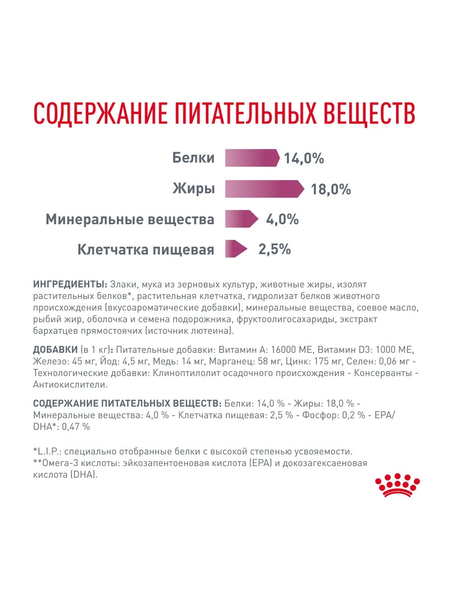 | Composition | Ingredients: rice, corn flour, animal fats, corn gluten, corn; hydrolysed animal proteins, beet pulp, wheat gluten*; minerals, fish oil, vegetable fibre, soya oil, fructooligosaccharides; psyllium seed husks; marigold extract (source of lutein). ADDITIVES (per 1 kg)***: Nutritional additives: Vita; min A: 15800 IU, Vitamin D3: 1000 IU, E1 (iron): 40 mg, E2 (iodine): 4 mg, E4 (copper): 12 mg; E5 (manganese): 52 mg; E6 (zinc): 154 mg. Technological additives: Clinoptilolite of sedimentary origin - 5 g Antioxidant; nts. NUTRITIONAL CONTENT: per 100 g of feed: Proteins 14 g, Fats 18 g, Carbohydrates 47.1 g; Dietary fiber 7.5 g, Total fiber 2.4 g, Omega 6 4.23 g, Omega 3 1.07 g, EPA + DHA 0.47 g; Calcium 0.4 g, Phosphorus 0.2 g, Sodium 0.35 g, Potassium 0.6 g, Vitamin D3 100 IU; Exchangeable (metabolic) energy** 398; 8 kcal COMPLEX OF ANTIOXIDANTS WITH SYNERGISTIC ACTION: Vitamin E 60 mg, Vitamin C 20 mg; Taurine 190 mg, Lutein 0; 5 mg * L. I. P. (Low Indigestible Protein): high-quality proteins with maximum digestibility; bridges. |
