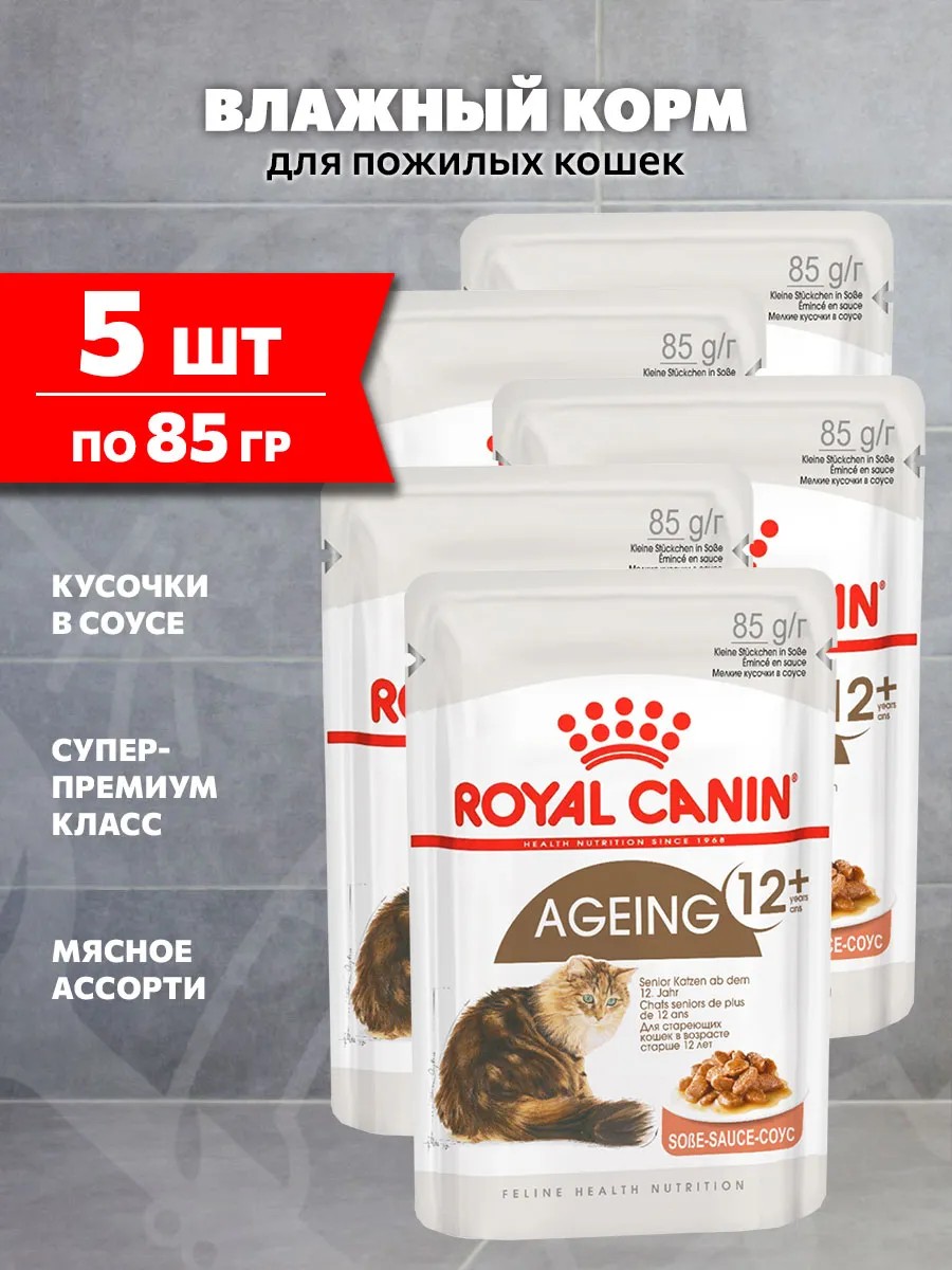 Корм консервированный полнорационный для стареющих кошек в возрасте старше 12 лет ageing 12+ (эйджинг 12+) royal canin, мелкие кусочки в соусе, подходящий для стареющих кошек в возрасте старше 12 лет, специально разработан с учетом потребностей вашей кошки в питательных веществах.