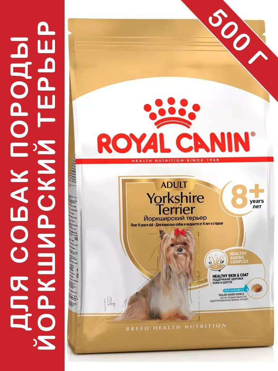 Royal Canin Yorkshire Terrier 8+ (Йоркширский Терьер Эдалт 8+ лет) — полнорационный корм для стареющих собак породы Йоркширский терьер старше 8 лет.Эксклюзивный комплекс антиоксидантов помогает сохранить здоровье клеток, а оптимальное содержание фосфора способствует поддержанию здоровья почек стареющих собак.Форма, размер, текстура и состав крокет специально разработаны с учетом небольшого размера челюстей стареющих собак породы Йоркширский терьер. Продукт содержит необходимые для поддержания здоровья зубов хелаторы кальция.Полезные свойства:-Адаптированная форма крокет, высокая вкусовая привлекательность, легко размачиваетсяФорма, размер, текстура и состав крокет специально разработаны с учетом небольшого размера челюстей стареющих собак породы Йоркширский терьер. Продукт содержит необходимые для поддержания здоровья зубов хелаторы кальция. Крокеты можно размягчить с помощью теплой воды, что способствует усилению аромата и облегчает поедание корма.-Поддержание здоровья стареющего организмаКорм для собак породы Йоркширский терьер в возрасте от 8 лет и старше разработан для поддержания здоровья в старости. Эксклюзивный комплекс антиоксидантов помогает сохранить здоровье клеток, а оптимальное содержание фосфора способствует поддержанию здоровья почек стареющих собак породы Йоркширский терьер.-Поддержание здоровья кожи и шерстиШерсть собак породы Йоркширский терьер отличается постоянным ростом и естественной мягкостью. Эксклюзивная формула корма помогает поддерживать здоровье длинной шерсти благодаря содержанию адаптированного количества Омега 3 и Омега 6 жирных кислот.-Поддержание здоровья пищеварительной системыСбалансированный состав корма обеспечивает оптимальную работу пищеварительной системы. Формула содержит высокоусвояемые белки пребиотики и клетчатку для поддержания баланса кишечной флоры и формирования фекалий оптимальной консистенции.-Высокоусвояемые белкиСпециально отобранные белки с высокой степенью усвояемости