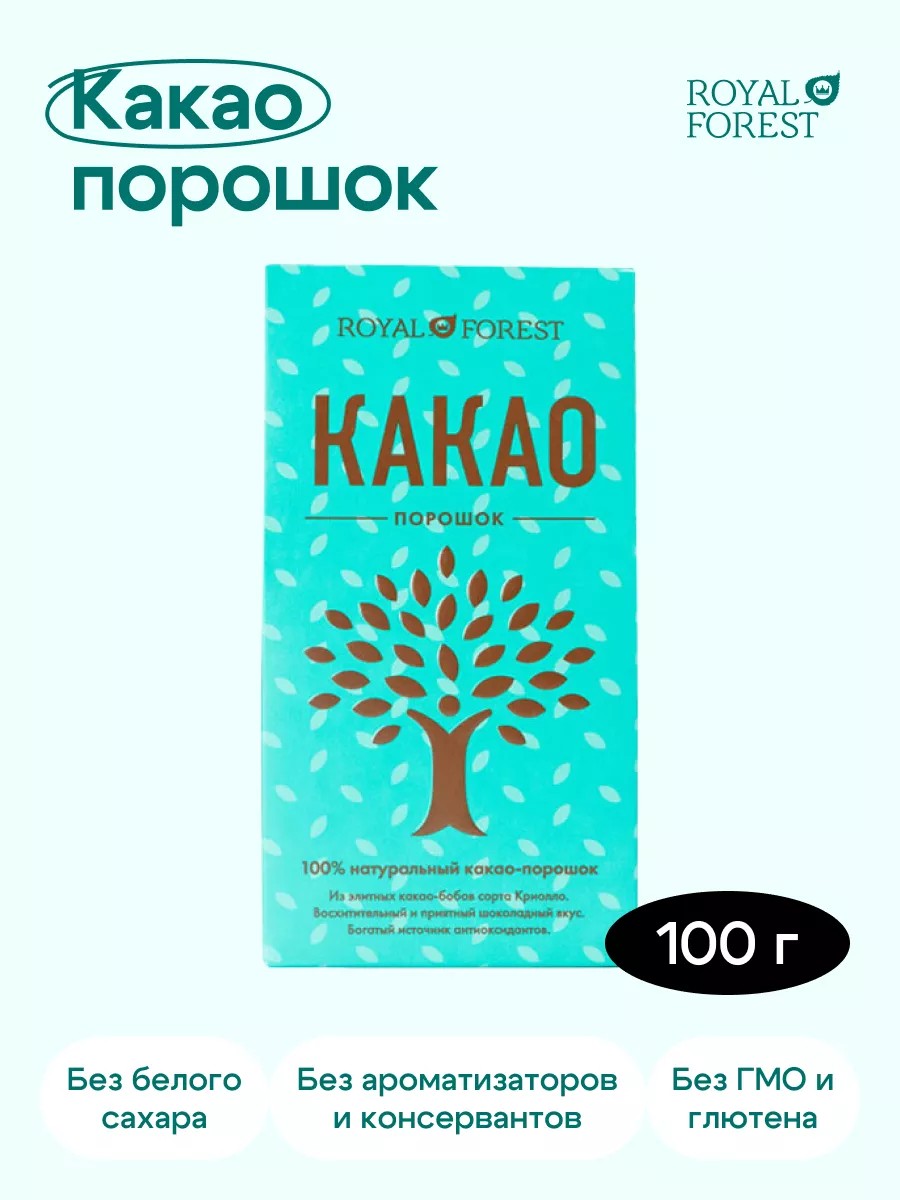 В основе какао порошка ROYAL FOREST лежат спелые и отборные колумбийские какао бобы элитного сорта Криолло, бережно высушенные и тщательно измельченные. Натуральный состав и насыщенный вкус делают продукт не только вкусным, но и полезным, Какао без сахара полностью натуральный продукт и станет прекрасной заменой кофе. Какао - мощный источник антиоксидантов, отличный антидепрессант, непревзойденный защитник иммунитета. Натуральный какао порошок Роял Форест увеличивает работоспособность, стимулирует умственную деятельность, улучшает память. Помимо этого, какао бобы помогают выводить из человеческого организма холестерин, также их рекомендуют гипертоникам и людям, страдающим болезнями сосудов и крови. Натуральный какао идеально подходит для изготовления кондитерских изделий, выпечки, обсыпки и украшения, приготовления кремов и напитков. Продукт без глютена станет незаменимым продуктом для поклонников здорового и правильного питания, а так же для любителей диетических продуктов без сахара.