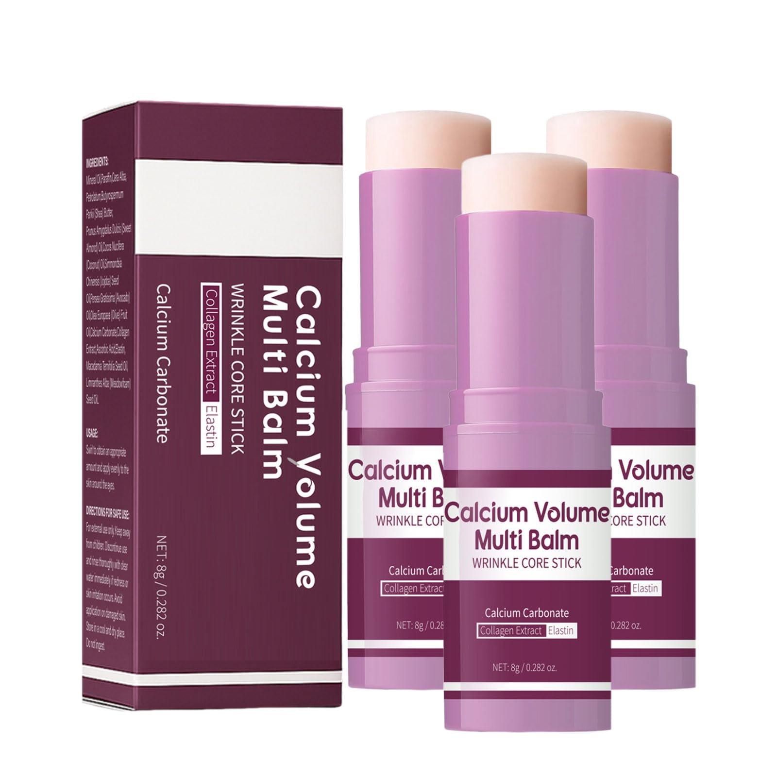 NET:8G SAFETY WARNING For external use only. Avoid eye contact. Keep it away from open flames and direct heat sources.Vitamin and calcium formula: enriched with calcium and nourishing ingredients, it strengthens the skin's natural moisture barrier. Formulated with shea butter, vitamin E and vegetable oils, it softens, soothes and promotes healthy regeneration. Portable stick design: This anti-wrinkle balm stick made from natural ingredients is suitable for all skin types. Thanks to the elegant packaging, it is also an ideal and thoughtful gift for family members, friends and colleagues. Long-lasting hydration: This multi-purpose balm combines the benefits of calcium and vitamin E with a rich blend of antioxidants and elastin. These ingredients work synergistically to repair dry and tight skin, minimize collagen breakdown and improve overall skin elasticity. Easily and quickly absorbed : The calcium volume multi-balm improves calcium absorption, supports collagen stability and effectively firms the sensitive skin around the eyes. It helps prevent moisture loss and ensures a long-lasting soft, supple complexion. Calcium Multi-Action Paste : Developed for face, eyes, lips and neck, this versatile moisturizer provides multiple nourishing benefits in one stick. Simplify your daily routine with nourishing hydration that meets all your skincare needs.Calcium Multi Balm, Calcium Volume Multi Balm, Anti-rimpel, collageen-vochtinbrengende stift, anti-aging, hydraterend, amandel en vitamine E voor gezicht, hals en ogen (3) NET:8G VEILIGHEIDSWAARSCHUWING Alleen voor uitwendig gebruik. Oogcontact vemeiden. Houd het uit de buurt van open vuur en directe warmtebronnen.Vitamine- en calciumformule: verrijkt met calcium en voedende ingrediënten versterkt het de natuurlijke vochtbarrière van de huid. Geformuleerd met sheaboter, vitamine E en plantaardige oliën, maakt de huid zacht, kalmeert deze en bevordert een gezonde regeneratie. Draagbaar stickdesign: deze van natuurlijke ingrediënten gemaakte anti-rimpelbalsem stick is geschikt voor alle huidtypes. Dankzij de elegante verpakking is het ook een ideaal en doordacht cadeau voor familieleden, vrienden en collega's. Langdurige hydratatie: deze multifunctionele balsem combineert de voordelen van calcium en vitamine E met een rijke mix van antioxidanten en elastine. Deze ingrediënten werken synergetisch om droge en strakke huid te repareren, de collageenafbraak te minimaliseren en de algemene huidelasticiteit te verbeteren. Gemakkelijk en snel intrekkend : de calcium volume multibalsem verbetert de calciumopname, ondersteunt de collageenstabiliteit en verstevigt effectief de gevoelige huid rond de ogen. Hij helpt vochtverlies te voorkomen en zorgt voor een langdurige zachte, soepele teint. Calcium Multi-Action Paste : deze veelzijdige vochtinbrengende crème is ontwikkeld voor gezicht, ogen, lippen en hals en biedt meerdere verzorgende voordelen in één stick. Vereenvoudig je dagelijkse routine met verzorgende hydratatie, die aan al je huidverzorgingsbehoeften voldoet.