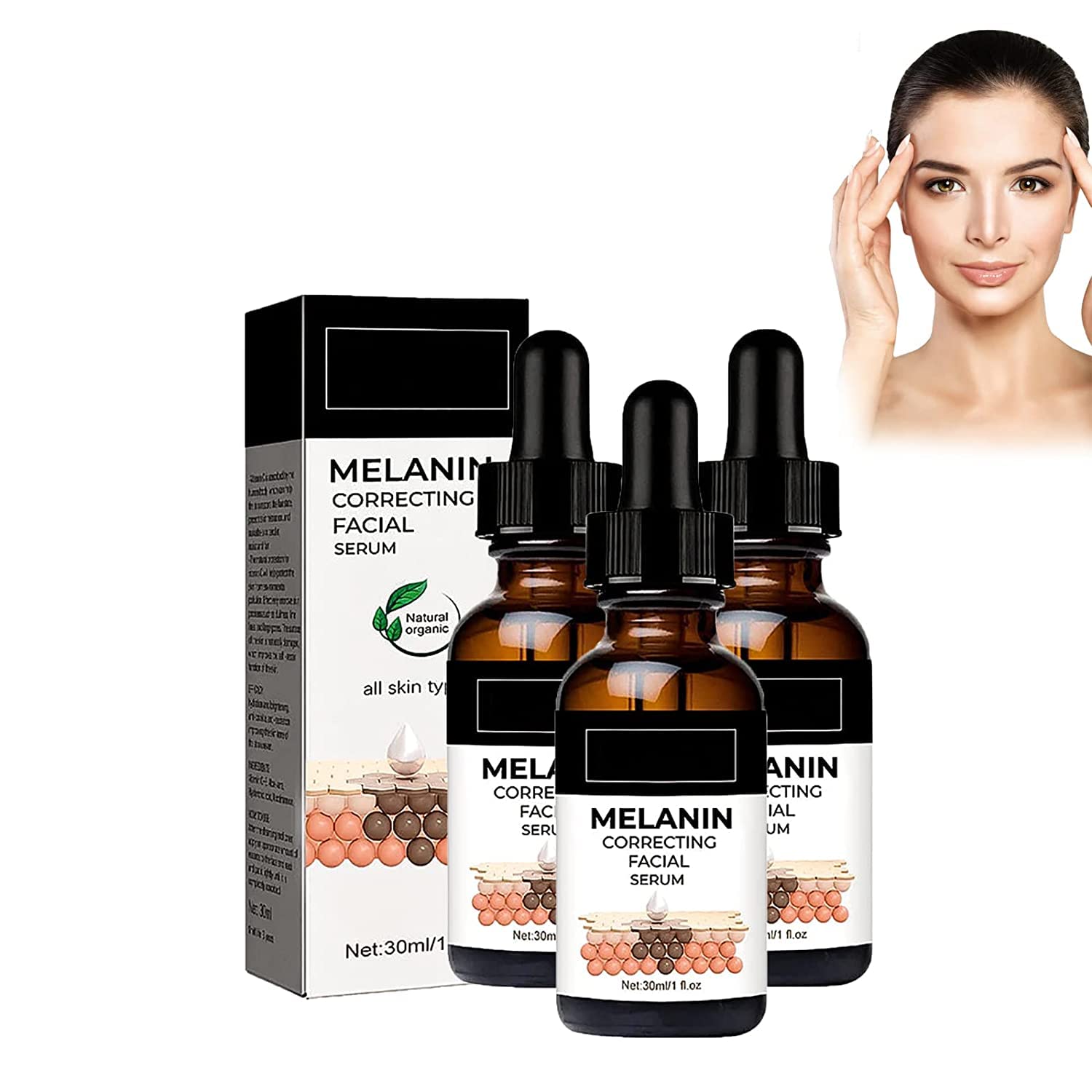 DESCRIPTION DU PRODUIT Use Method: 1. Wash and dry your face. 2. Dispense 2-3 drops onto the palm of clean hand and use fingertips to massage into face and neck until fully absorbed. 3. Follow up with your favorite moisturizer. Repeat morning and night. Specification Net content: 30ml wight: 48g Shelf life: 3 years Package Includes: 3 Pcs x Melanin Correcting Facial Serum