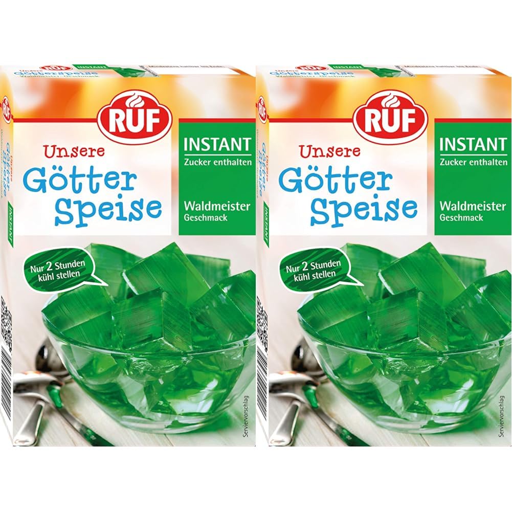 Ingredients / ingredients Ingredients: sugar (92.7 %), gelling agent carrageen, acid remedy Citronen acid, acid gulcator potassium citrate, aroma, dyes (riboflavine, patent blue V).Can contain traces of shell fruits, milk, soy and egg. Instructions You still need: 500 ml (1/2 l) Water Preparation: Put the contents of the bag in a glass bowl.Bring 500 ml of water to a boil (e.g. in the kettle) and pour over the powder.Mix with a whisk until the powder has completely dissolved.Filled the gods in the glass bowl or in portion glasses, put in the fridge for about 2 hours. Warnings not applicable More the colorful world of call: Since 1920, calling a call with a colorful variety of tried and tested & new products.We offer quality products at a reasonable price for young and old.Be creative: With a little less water, cubes or other works of art can also be created from the wobbly pudding - let your creativity run free!.It tastes all year round: Our wobbly peter creations taste good all year round.Pudding is particularly popular with a wooden maker in combination with whipped cream or vanilla sauce.If you have to go quickly: the green instant gods dish is quickly prepared with boiling water and after only 2 hours is already ready for consumption - perfect if things have to be done quickly.Wappy dessertlieb: The delicious gods with the distinctive woodruff taste is a real classic among the desserts.The refreshing taste ensures pure enjoyment in young and old. The following information applies to each unit per pack. INHALTSSTOFFE / ZUTATEN Zutaten: Zucker (92,7 %), Geliermittel Carrageen, Säuerungsmittel Citronensäure, Säureregulator Kaliumcitrate, Aroma, Farbstoffe (Riboflavine, Patentblau V). Kann Spuren von SCHALENFRÜCHTEN, MILCH, SOJA und EI enthalten. GEBRAUCHSANWEISUNG Sie benötigen noch: 500 ml (1/2 l) Wasser Zubereitung: Den Inhalt des Beutels in eine Glasschale geben. 500 ml Wasser zum Kochen bringen (z.B. im Wasserkocher) und über das Pulver gießen. Mit einem Schneebesen verrühren, bis sich das Pulver vollständig aufgelöst hat. Die Götterspeise in der Glasschale oder in Portionsgläser umgefüllt, etwa 2 Stunden in den Kühlschrank stellen. WARNHINWEISE nicht zutreffend MehrDIE BUNTE WELT VON RUF: Seit 1920 verwöhnt RUF mit einer bunten Vielfalt an altbewährten & neuen Produkten. Wir bieten Qualitätsprodukte zu einem angemessenen Preis für Groß und Klein. SEI KREATIV: Mit etwas weniger Wasser lassen sich auch Würfel oder andere Kunstwerke aus dem Wackelpudding kreieren - lass deiner Kreativität freien Lauf!. SCHMECKT DAS GANZE JAHR: Unsere Wackelpeter-Kreationen schmecken das ganze Jahr über. Besonders gerne wird der Pudding mit Waldmeister-Geschmack in Kombination mit Schlagsahne oder Vanillesoße verzehrt. WENN ES SCHNELL GEHEN MUSS: Die grüne Instant Götterspeise wird mit kochendem Wasser schnell zubereitet und ist nach nur 2 Stunden im Kühlschrank schon verzehrfertig - perfekt, wenn es mal wieder schnell gehen muss. WACKELIGER DESSERTLIEBLING: Die leckere Götterspeise mit dem unverwechselbaren Waldmeister-Geschmack ist ein echter Klassiker unter den Desserts. Der erfrischende Geschmack sorgt für einen puren Genuss bei Jung und Alt. Die folgenden Informationen gelten für jede Einheit pro Packung.RUF Instant Götterspeise Waldmeister-Geschmack, Wackelpudding, Götterspeisenpulver, schnelle Zubereitung, nur Wasser hinzufügen, 2er Pack, 1 x 100g 100 g (2er Pack) Waldmeister