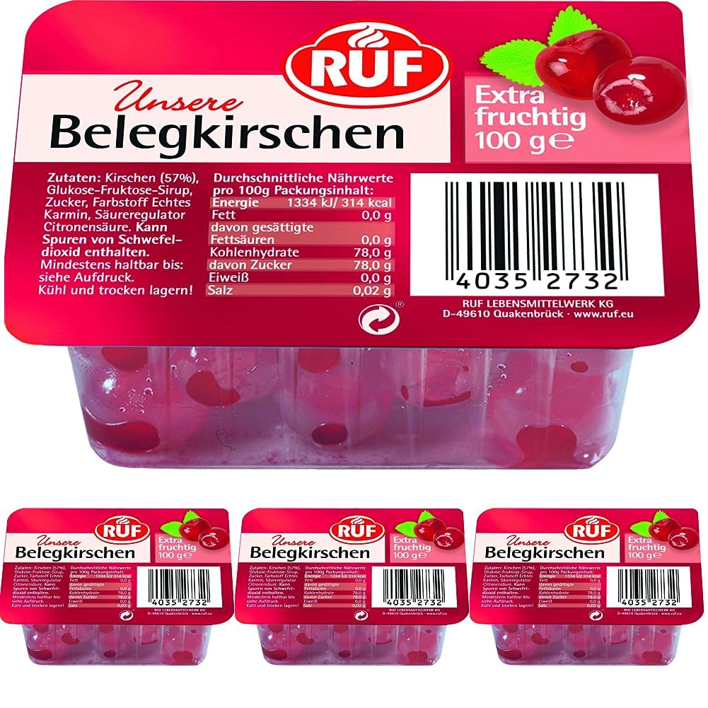 Ingredients ingredients Ingredients: cherries, glucose fructose syrup, sugar, acid regulator: citronic acid Color: real carmine.Can contain traces of sulfur dioxide. Instructions To garnish cakes and pastries, ice cream and desserts. Warnings not applicable Morethe colorful world of call: Since 1920, reputation has been spoiled with a colorful variety of well -tried and new products.We offer quality products at a reasonable price for young and old.The back specialists: With tried and tested and new call products, we offer you, your family and your friends desserts baking products that fit in every household.Perfect decoration: In addition to the Amarena cherry, bonding cherries are among the most popular types of sour cherry.They are an indispensable part of cocktails, which is why they are also known as cocktail cherries.Fruity non-alcoholic: Cherries are fruity-sweet in taste and alcohol-free.They not only bring a taste, but also an optical refinement for long drinks, desserts cakes.To refine: the Maraschino cherries are made from sour cherries and inserted into syrup.The sweet taste brings a taste for cocktails, drinks, desserts tarts.The following information applies to each unit per pack.INHALTSSTOFFE ZUTATEN Zutaten: Belegkirschen, Glukose-Fruktose-Sirup, Zucker, Säureregulator: Citronensäure Farbstoff: Echtes Karmin. Kann Spuren von SCHWEFELDIOXID enthalten. GEBRAUCHSANWEISUNG Zum Garnieren von Torten und Gebäck, Eis und Desserts. WARNHINWEISE nicht zutreffend MehrDIE BUNTE WELT VON RUF: Seit 1920 verwöhnt RUF mit einer bunten Vielfalt an altbewährten und neuen Produkten. Wir bieten Qualitätsprodukte zu einem angemessenen Preis für Groß und Klein. DIE BACKSPEZIALISTEN: Mit altbewährten und neuen RUF-Produkten bieten wir dir, deiner Familie und deinen Freunden Desserts Backprodukte, die in jeden Haushalt passen. PERFEKTE DEKORATION: Belegkirschen gehören, neben der Amarena-Kirsche, zu den beliebtesten Sauerkirsch-Arten. Sie sind ein unverzichtbarer Bestandteil von Cocktails, weshalb sie auch als Cocktail-Kirschen bekannt sind. FRUCHTIG ALKOHOLFREI: Belegkirschen sind fruchtig-süß im Geschmack und dazu alkoholfrei. Dabei bringen sie nicht nur eine geschmackliche, sondern auch eine optische Verfeinerung für Long-Drinks, Desserts Kuchen. ZUM VERFEINERN: Die Maraschino-Kirschen werden aus Sauerkirschen hergestellt und in Sirup eingelegt. Der süße Geschmack bringt eine geschmackliche Verfeinerung für Cocktails, Drinks, Nachspeisen Torten. Die folgenden Informationen gelten für jede Einheit pro Packung.RUF Rote Beleg-Kirschen, extra fruchtige alkoholfreie Cocktail-Kirschen, entsteinte Maraschino-Kirschen für Torten, Obstsalat Cocktails, 1 x 100g (Packung mit 4) 4er Pack á 1x100g