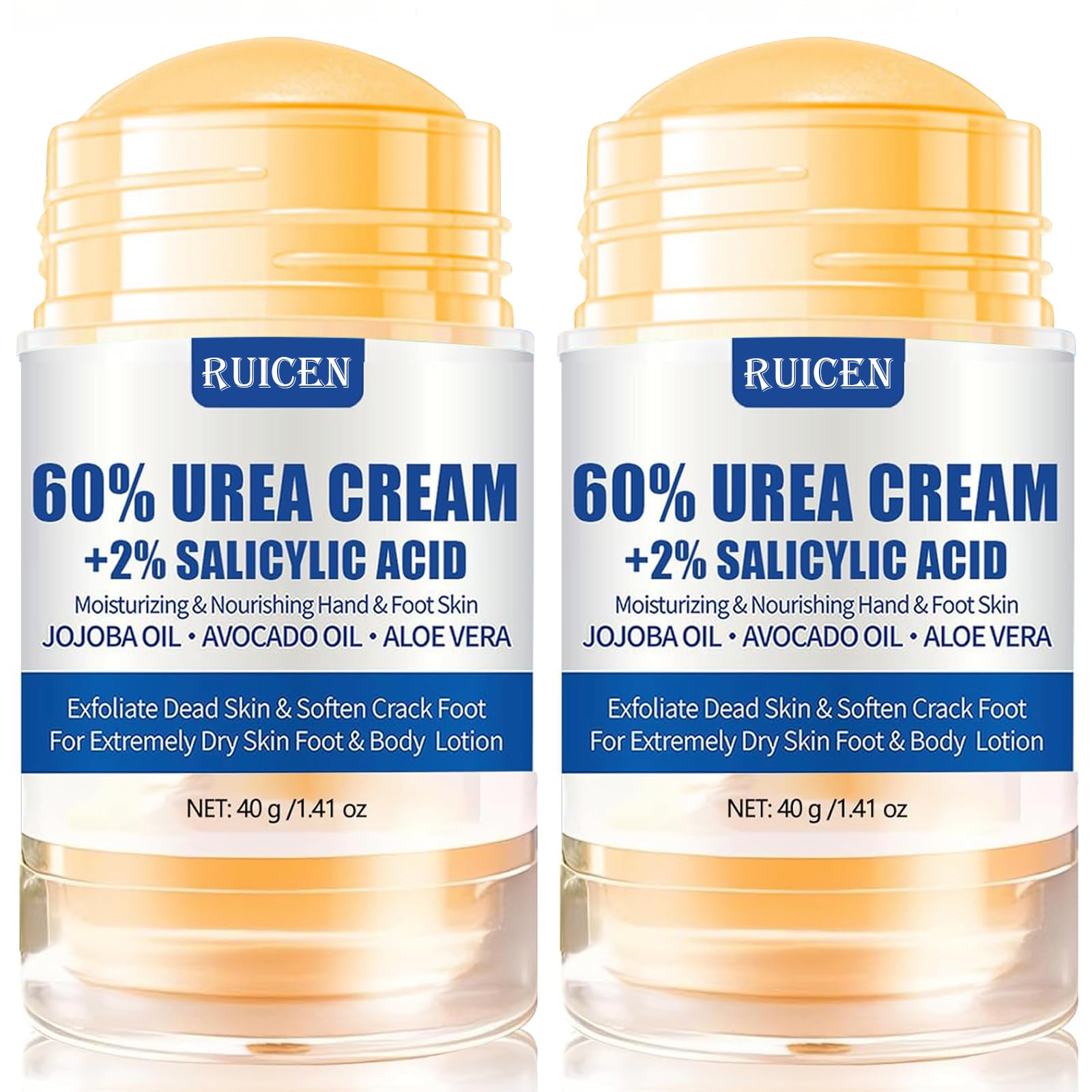 INGREDIENTS 60 Urea, Tea Tree Oil, Aloe Vera, Avocado Oil, 2 Salicylic AcidSafe and premium ingredients: This extremely dry foot cream is dermatologically tested and guaranteed safe, non-irritating, hypoallergenic, and GMO-free. It's a cream for very dry feet, suitable for cracked heels, heels, ankles, elbows, legs, toenails, and knees. Visible results in just 7 days : Within a week of effective application, you'll notice a significant improvement in your skin. We recommend thoroughly cleaning your feet before use. Massage the dry foot cream into clean, dry skin until fully absorbed. For best results, regular use for 2-3 weeks will leave your skin silky smooth and moisturized. Easy to use: One of its outstanding features is the roll-on applicator. No mess or fuss like with a tube or Pump-Ruicen foot applicator you can roll the cream directly onto your skin, making the process quick, clean, and controlled. The extremely dry foot cream glides smoothly over the skin and distributes the cream evenly where you need it most. Ideal for taking on vacation, etc. Soothes dry skin: The callus cream is enriched with aloe vera and other gentle ingredients, as well as 60 urea cream 2 salicylic acid. It can remove dry, cracked, rough, bumpy, and aging skin and also provides a good exfoliating boost. Effectively moisturizes and nourishes the skin on hands and feet and reduces corns and other fungal infections. Powerful moisturizing cream: Ruicen's 60 urea cream intensely hydrates, completely absorbs dead skin, and effectively repairs cracked and flaky feet with rich moisture. It makes hard areas noticeably softer, leaving skin moisturized without feeling greasy. You'll enjoy lasting suppleness and a pleasant feel, leaving your feet healthy and radiant.Crème à l'urée 60 Percent pour les pieds, à l'uréeDESCRIPTION DU PRODUIT INGRÉDIENTS 60 d'urée, huile d'arbre à thé, aloe vera, huile d'avocat, 2 acide salicyliqueIngrédients sûrs et de qualité supérieure : la crème pour les pieds extrêmement secs est testée dermatologiquement et garantit une sécurité sûre, non irritante, hypoallergénique et sans OGM. Crème pour les pieds très secs pour les talons fissurés, les talons, les chevilles, les coudes, les jambes, les ongles des orteils et les genoux. Résultats visibles en seulement 7 jours : dans une semaine après une application efficace, vous remarquerez une amélioration significative de votre peau. Nous vous recommandons de nettoyer soigneusement les pieds avant utilisation. Massez la crème pour les pieds secs sur une peau propre et sèche jusqu'à ce qu'elle soit complètement absorbée. Pour de meilleurs résultats, une utilisation régulière pendant 2 à 3 semaines vous donne une peau soyeuse et hydratée. Facile à utiliser : l'une des caractéristiques exceptionnelles est l'applicateur à bille roulante. Pas de désordre ou de pétillant comme un tube ou un applicateur Pumpe-Ruicen pour les pieds, vous pouvez rouler la crème directement sur votre peau, de sorte que le processus est rapide, propre et contrôlé. La crème pour les pieds extrêmement secs glisse doucement sur la peau et répartit la crème uniformément là où vous en avez le plus besoin. Idéal à emporter en vacances, etc. Soulage la peau sèche : la crème anti-callosités est enrichie en aloe vera et d'autres ingrédients doux et en crème urea 60 2 d'acide salicylique. Il peut enlever la peau sèche, craquelée, rugueuse, bosselée et vieillissante et donne également un bon coup de gommage. Hydrate et nourrit efficacement la peau des mains et des pieds et réduit les cors et autres infections fongiques. Crème hydratante puissante : la crème urea 60 de Ruicen hydrate intensément, elle absorbe complètement les peaux mortes et peut réparer efficacement les pieds fissurés et les peaux squameuses avec une hydratation riche et rend les zones dures sensiblement plus douces, et la peau est hydratée sans graisser. Vous bénéficiez d'une souplesse durable et d'une sensation agréable sur la peau, ce qui rend vos pieds sains. Brillance.