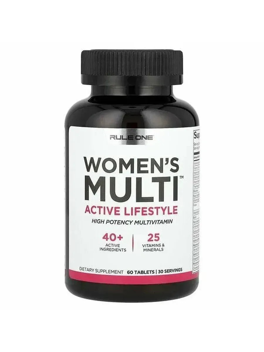 Rule One Women's Active Lifestyle MULTIVITAMIN (60 tablets) is the perfect balance of vitamins and minerals, created specifically for modern women who lead an active lifestyle and care about their health! This complex contains carefully selected ingredients, including vitamins A, C, D, E, B vitamins, iron, calcium, magnesium, zinc, and antioxidants, which help maintain energy, strengthen the immune system, improve the condition of skin, hair, and nails, and normalize hormonal balance. The formula is designed with the specific needs of the female body in mind, helping to increase endurance, accelerate recovery after physical activity, and protect against stress. Just 2 tablets a day will provide you with a boost of energy, beauty from within, and excellent well-being for a long time. Rule One Women's Active Lifestyle MULTIVITAMIN is more than just vitamins; it's your reliable assistant in your daily self-care! Try it and feel the difference after just a few weeks! Serving Size: 2 Tablets Servings Per Container: 30 Amount Per Serving % Daily Value Vitamin A (as retinyl acetate) 1,000 mcg 111% Vitamin C (ascorbic acid) 300 mg 333% Vitamin D (as cholecalciferol) 40 mcg 200% Vitamin E (as d-alpha tocopheryl succinate) 100 mg 667% Vitamin K (as phytonadione) 120 mcg 100% Thiamin (as Thiamine HCl) 50 mg 4.167% Riboflavin 50 mg 3.846% Niacin (as niacinamide) 50 mg 313% Vitamin B6 (as pyridoxine hydrochloride) 30 mg 1.765% Folate 1,000 mcg DV (600 mcg Folic Acid) 250% Vitamin B12 (as Cyanocobalamin) 50 mcg 2.083% Biotin 250 mcg 833% Pantothenic Acid (as Calcium D-Pantothenate) 50 mg 1.000% Choline (as Choline Bitartrate) 50 mg 9% Calcium (as Calcium Carbonate) 150 mg 12% Iron (as Ferrous Fumarate) 18 mg 100% Iodine (as Potassium Iodide) 200 mcg 133% Magnesium (as Magnesium Oxide) 75 mg 18% Zinc (as Zinc Oxide) 15 mg 136% Selenium (as L-Selenomethionine) 70 mcg 127% Copper (as Cupric Oxide) 2 mg 222% Manganese (as Manganese Sulfate) 5 mg 217% Chromium (as Chromium Chloride) 120 mcg 343% Molybdenum (as Sodium Molybdate) 70 mcg 156% Angelica Root Powder 80 mg, Chaste Tree Fruit Extract 50 mg, Uva Ursi Leaf Powder 50 mg, Horse Chestnut Seed Extract 30 mg, Butcher's Broom Root Extract 30 mg, Silicon Dioxide 25 mg, Cranberry Fruit Powder 25 mg, Black Cohosh Root Extract 25 mg, Grape Seed Extract 20 mg, Alpha Lipoic Acid 20 mg, Citrus Bioflavonoids Peel Powder 20 mg, Garlic Bulb Powder 15 mg, Soy Isoflavones (from soy extract) 5 mg, Inositol 5 mg, Boron (as boron citrate) 2 mg, Lycopene 200 mcg, Lutein 200 mcg, Alpha-carotene 100 mcg, Cryptoxanthin 100 mcg, Zeaxanthin 100 mcg, Ingredients Microcrystalline cellulose, stearic acid, dicalcium phosphate, sodium croscarmellose, magnesium stearate, pharmaceutical glaze (shellac, povidone). Contains: Soy.