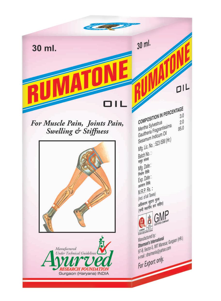 Joint Massage Oil. Trusted Brand: Rumatone is a reputable brand known for its high-quality, effective herbal products. Convenient Pack: The pack of 3 bottles ensures you have enough supply for regular use. Natural Ingredients: Made with all-natural, herbal ingredients, this oil is free from harmful chemicals or additives. Powerful Blend: This pack of 3 Rumatone oil bottles (30ml each) contains a potent blend of Mentha Sylvestrus, Gaultheria Frafrantissima, and sesamum Indicum oil.