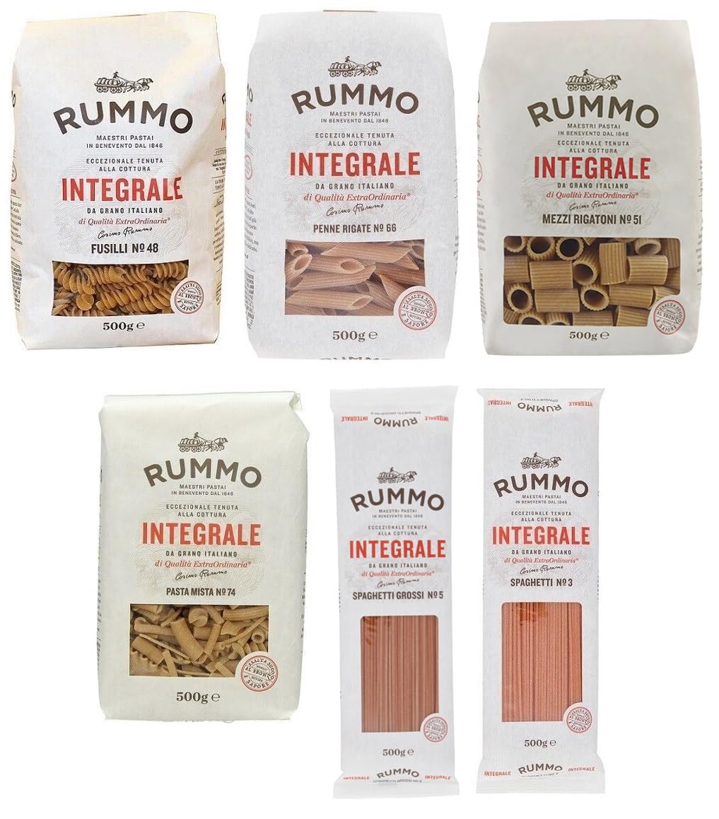 1 pack of Rummo Pasta Whole Wheat Spaghetti No. 3, 500g whole grain pasta with shells, with tomato sauce, or simply with garlic, oil, and chili pepper. A true classic of Italian cuisine. 1 pack of Rummo Pasta Integrale Fusilli No. 48, 500g whole grain pasta, a typical Italian shape from the South, where it is known throughout the country with different names and shapes, depending on local culinary traditions. 1 pack of Rummo Pasta Penne Rigate No. 66, 500g whole grain pasta, one of the most widespread and versatile shapes in traditional Italian cuisine. It pairs perfectly with any type of sauce. 1 pack of Rummo Pasta Mista Integrale No. 74, 500g whole wheat pasta. Pasta Mista originated in Campania, where various pasta shapes were blended and cooked together. Ideal for soups and stews made with legumes and vegetables. 1 pack of Rummo Grossi Grossi Integrale No. 5, 500g whole grain spaghetti noodles. Famous for their firm texture and the way they absorb spices, they are perfect for more aromatic sauces, such as those in meat or shellfish stews. 1 pack of Rummo Mezzi Rigatoni No. 51, 500g whole grain pasta. Shorter than rigatoni, these are ideal for thick sauces that penetrate the pasta and are easily absorbed by the pasta mold. Excellent with mussels and beans, scampi, or artichoke cream. The world's first whole wheat pasta with certified cooking strength. Slow processing method: Thanks to our exclusive slow processing method, Rummo is the world's first whole wheat noodle with certified cooking strength. We carefully check each batch to ensure it meets our toughness and strength parameters before purchase. COOKING INSTRUCTIONS Bring salted water to a boil. Add the pasta and cook for 8 to 13 minutes, depending on the type of pasta. Drain and serve.Rummo Pasta Integrale Lot de 6 paquets de 6 variétés différentes de pâtes à grains entiers 500 gDESCRIPTION DU PRODUIT DESCRIPTION DU PRODUIT 1 paquet de pâtes Rummo Pasta spaghetti intégrales N 3, pâtes de grains entiers de 500 g avec coquillages, avec tomate ou seulement avec de l'ail, de l'huile et du piment. Vous représentez toujours le grand classique de la cuisine italienne. 1 paquet de pâtes Rummo Pasta Integrale Fusilli N 48, les pâtes à grains entiers de 500 g sont un format italien typique du Sud, où ils sont connus dans toutes les régions avec un nom et une forme différents, selon les traditions gastronomiques locales. 1 paquet de pâtes intégrales Rummo Pasta Penne Rigate N 66, pâtes de grains entiers de 500 g, l'un des formats les plus répandus et plus polyvalents que la tradition de la cuisine italienne. Elles s'adaptent à la perfection à tout type de sauce. 1 paquet de pâtes Rummo Pasta Mista Integrale n 74, pâtes de blé entier de 500 g, Pasta Mista est né en Campanie, où les différentes formes avancées ont été mélangées et cuites ensemble. Idéal pour les soupes et les ragoûts à base de légumineuses et de légumes. 1 paquet de pâtes à grains entiers Rummo Grossi Grossi Integrale N 5, nouilles de grains entiers de 500 g de spaghetti, célèbres pour leur ténacité et la rugosité avec laquelle elles capturent chaque épice, elles s'adaptent parfaitement aux sauces plus aromatiques, comme les ragoûts à base de viande. ou crustacés. 1 paquet de pâtes complètes Rummo Mezzi Rigatoni N 51, pâtes de grains entiers de 500 g. Elles sont plus courtes que les rigatoni et sont idéales pour les sauces épaisses qui pénètrent à l'intérieur et se laissent reprendre par le moule. Excellent pour les moules et les haricots, les scampi ou la crème d'artichauts. Les premières pâtes de blé entier au monde avec une résistance à la cuisson certifiée. Méthode de traitement lent : grâce à la méthode exclusive de traitement lent, Rummo est la première nouilles de blé entier au monde avec une résistance à la cuisson certifiée. Nous vérifions soigneusement chaque lot pour nous assurer qu'il respecte les paramètres de ténacité et de résistance à l'achat. MODE D'EMPLOI Faire bouillir de l'eau salée. Ajouter les pâtes et laisser cuire pendant 8 à 13 minutes selon le type de pâte. Égoutter et servir.