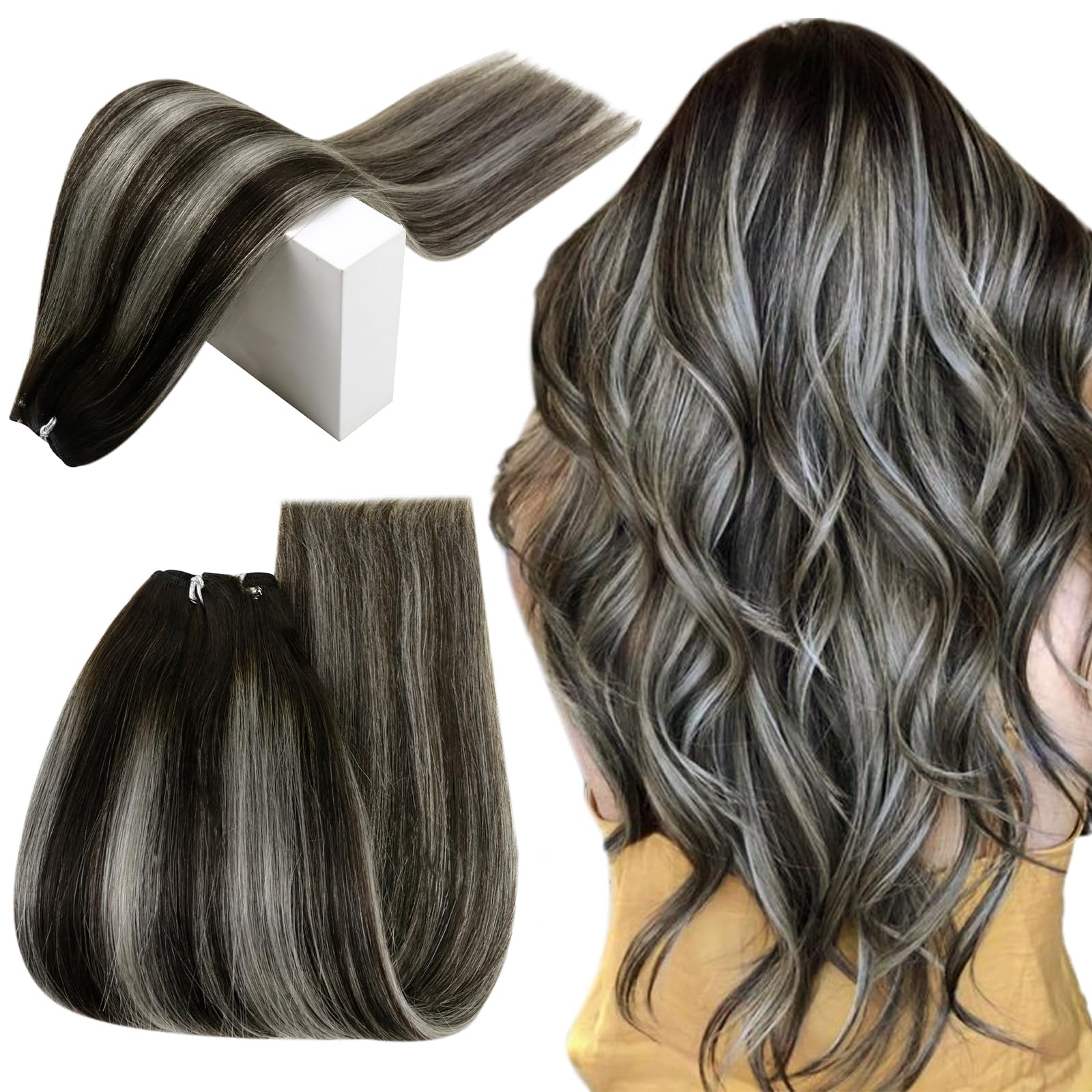 RUNATURE Balayage Echthaar Tressen Schwarz Silber 50cm 100g Sew in Haarverlängerung Remy Menschliches Haar Glatt Weaving Tressen Echthaar zum Einnähen Schwarz Ombre Silber 1B Silver 1B 50CM 2-Tressen 1B S 1B