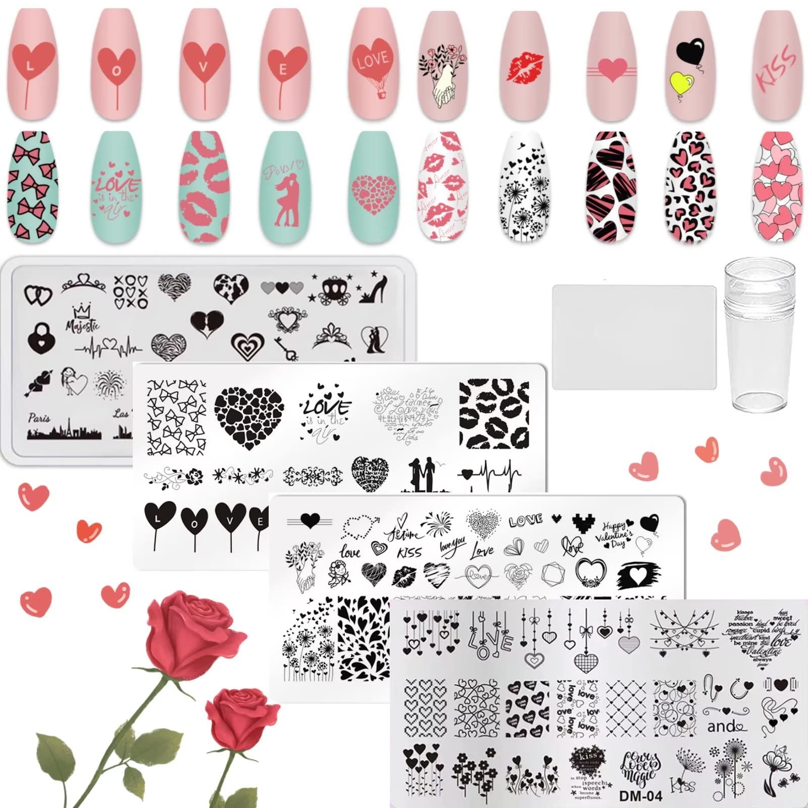 RUNRAYAY 6Pcs Heart Nail Stamping Plates Set with Nail Stamper & Scraper, Valentine's Day Theme Nail Art Stamping Plates Love Lips Plaid Stamp Templates Kit Nail Image Manicuring DIY Printing Tools PACKAGE CONTENTS: 4Pcs nail art stamp template 1pc nail Stamper 1pc nail Scraper How to use: 1. Apply base coat or regular polish on the nail. 2. Remove the blue film on plates, apply the nail polish to desired image within a plate. (Recommended: Use the Solid Color Nail Polish, so that the texture will be thicker than other nail polish) 3. Make a scraper leaned over 45 degrees and scrape excessive polish off quickly and strongly from inside to outside. 4. Immediately press the stamper with a gentle rolling motion to pick up the design. The image is transferred on the stamp. 5. Stamp the image on your nail with a gentle rolling motion. The image is transferred on your nail. 6. Repeat the above steps for all of your nails. 7. After stamping nail art, apply top coat for lasting wear. Tips for stamping 1)Prepare transparent adhesive tape, it is easy to clean the stamper with the tape.The choice of nail polish,it depends on the viscosity and concentration of the polish,we’d better chose the stamping polish to operate it. 2)Smoothing the scraper -The new scraper maybe not so smooth, we can smooth some time before using; -We should try different angle and different strength to scrape to get a perfect stamping effect. 3)stamp along the arc of the stamper, press on one direction only one time. 4)Try more times with different degree and different polish ,you will get a easy nail art ! 5)For beginner, we suggest stamping polish, which is professional for stamping !?[Sweet Using Tip]: Pls peel off blue protect film before using, transfer image with the reusable clear jelly, and stamp on plate by the stamper. The trick is to make the movment by 45 degree fast to stamp the figure on the plate, with practice you can transfer well. ?[Choose The Right Nail Polish]: Due to different nail polish quality, some nail polish is not suitable for stamping, please choose the right nail polish. Please try again if you can not transfer the design to the stamper on the first time. ?[Size & Material]: Each nail art stencil measures 12x6cm /4.7x2.4inch, which is the right size for everyone's nails. The stencil is made of premium stainless steel material, which can be reused many times and not easily damaged. ?[Valentine's Day Theme]: The nail art nail stamping plates feature a Valentine's Day theme that can be used together for practicality and beauty. The classic elements, come in various shapes and styles to meet a variety of different nail art production needs. ?[Package Included]: 4Pcs nail art plates, 1 stampers, 1 scrapers. Due to different nail polish quality, some nail polish is not suitable for stamping, please choose the right nail polish. Please try again if you can not transfer the design to the stamper on the first time.
