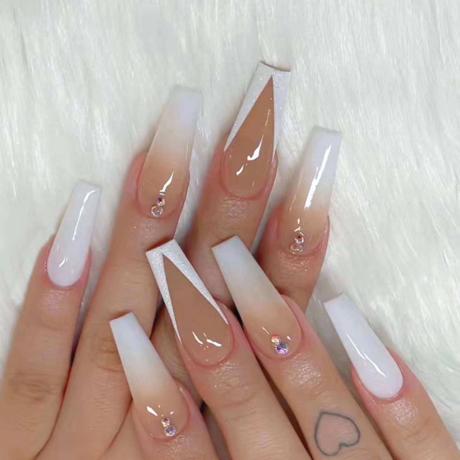 [Durable, Stay On Longer]: This salon-friendly nail is made of high-quality materials and coatings to ensure that the press on nails will not be breaked or chipped. It is easy to trim and file them to in any length and shape you like!. [A Complete Set]: 24 pieces glossy press on nails, 1pcs nail file, 24pcs nail double-side stickers,1pc wooden stick for removing. Affordable price is friendly to both nail art beginners and professionals. [Improved Technologies]: After research, we found that the press on nails made by other fake nails are flimsy and easy to crack, thin transparent, we now change the mold and success came after several attempts. We finally developed thin and strong nails. [10 Sizes Natural Fit]: There is a number on the back of each nail, 0-9. The side of each nail facing the stratum corneum is lighter and thinner(the side without numbers), and it fits the nail bed more closely. The real natural effect. [Nude Rhinestones Gradient Style]: Latest extra long acrylic nails press on are decorated with fashionable French style as well French Tips. Glossy nude color are suitable for matching daily outfits and show out confident.