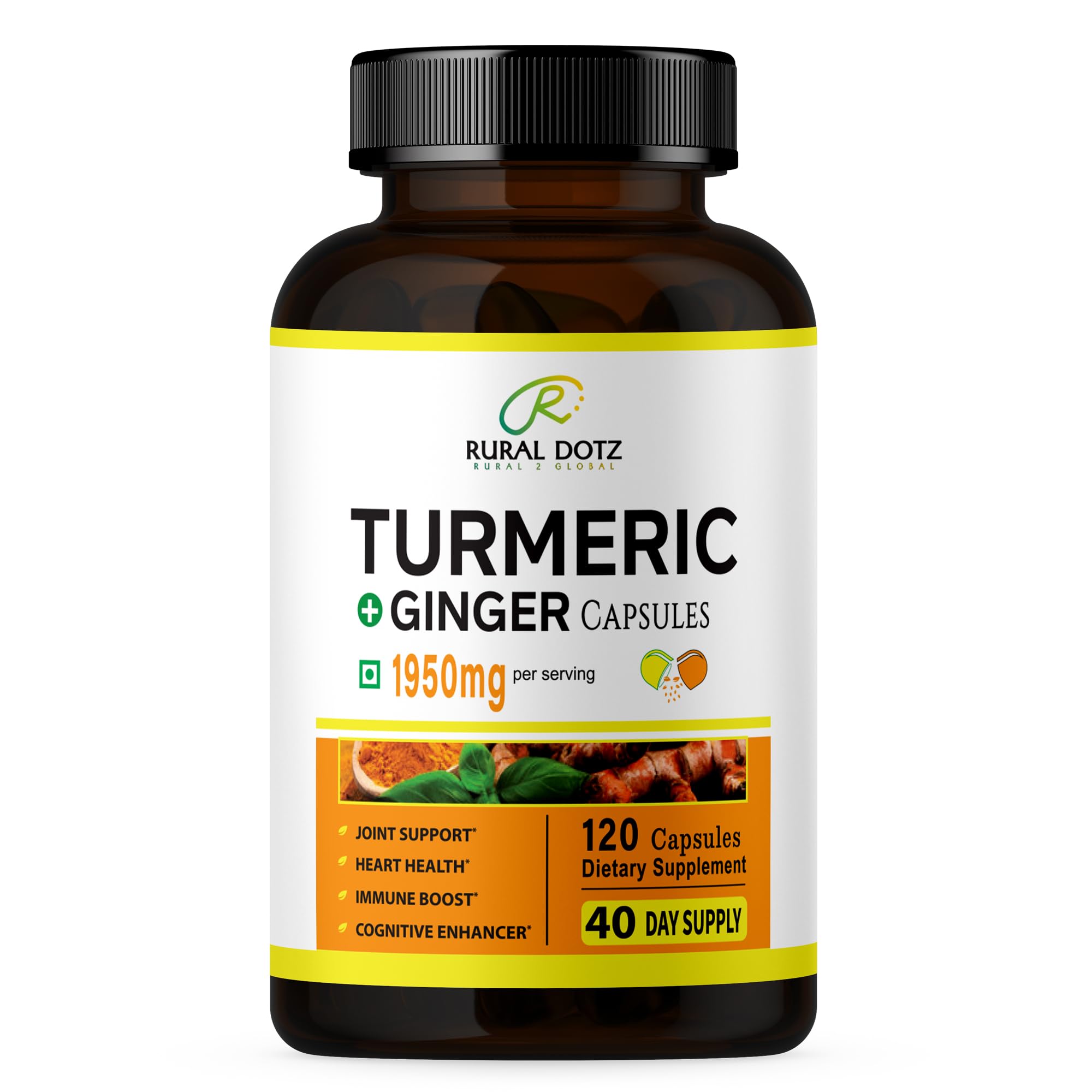 Rural Dotz Turmeric Curcumin Supplement 1950mg with Turmeric & Ginger 95% Curcuminoids Black Pepper for Best Absorption Nature's Vegan Joint Support 120 Capsules