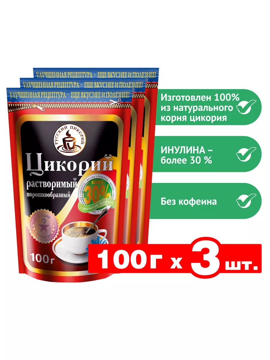 Растворимый порошкообразный цикорий в пакете дой-пак с застежкой zip отличается экономичной упаковкой и удобством хранения. Новая серия продукции - растворимый порошкообразный цикорий, получаемый из экстракта цикория путем сушки. По виду и способу приготовления полностью аналогичен растворимому кофе, очень удобен в использовании. Особенность данной упаковки с застежкой zip состоит в том, что содержимое пакета может оставаться герметично упакованным до следующего использования. Цикорий это давно известное целебное растение, содержащее массу полезных веществ. Цикорий полезен для сердечно-сосудистой, нервной и пищеварительной систем человека. Он способствует расширению сосудов, выведению холестерина, нормализации работы сердца, улучшению работы печени, успокаивает нервную систему, все благодаря содержащимся в нем калию, каротину, горечам, витаминам группы В и С и микроэлементам. Наиболее ценным веществом, содержащимся в цикории, является полисахарид инулин (В цикории ТМ «Русский цикорий» его более 30 %), который нормализует пищеварение, улучшает обмен веществ и тем самым способствует улучшению общего состояния организма.Помимо этого, цикорий не содержит кофеина, поэтому его можно употреблять даже детям и беременным женщинам.** МОСКОВСКАЯ МЕДИЦИНСКАЯ АКАДЕМИЯ им. И.М. СЕЧЕНОВАЛекарственные растения Государственной фармакопеи. Фармакогнозия (под ред. И.А. Самылиной, В.А. Северцева). АМНИ М., 2003, 534 стр. с ил.