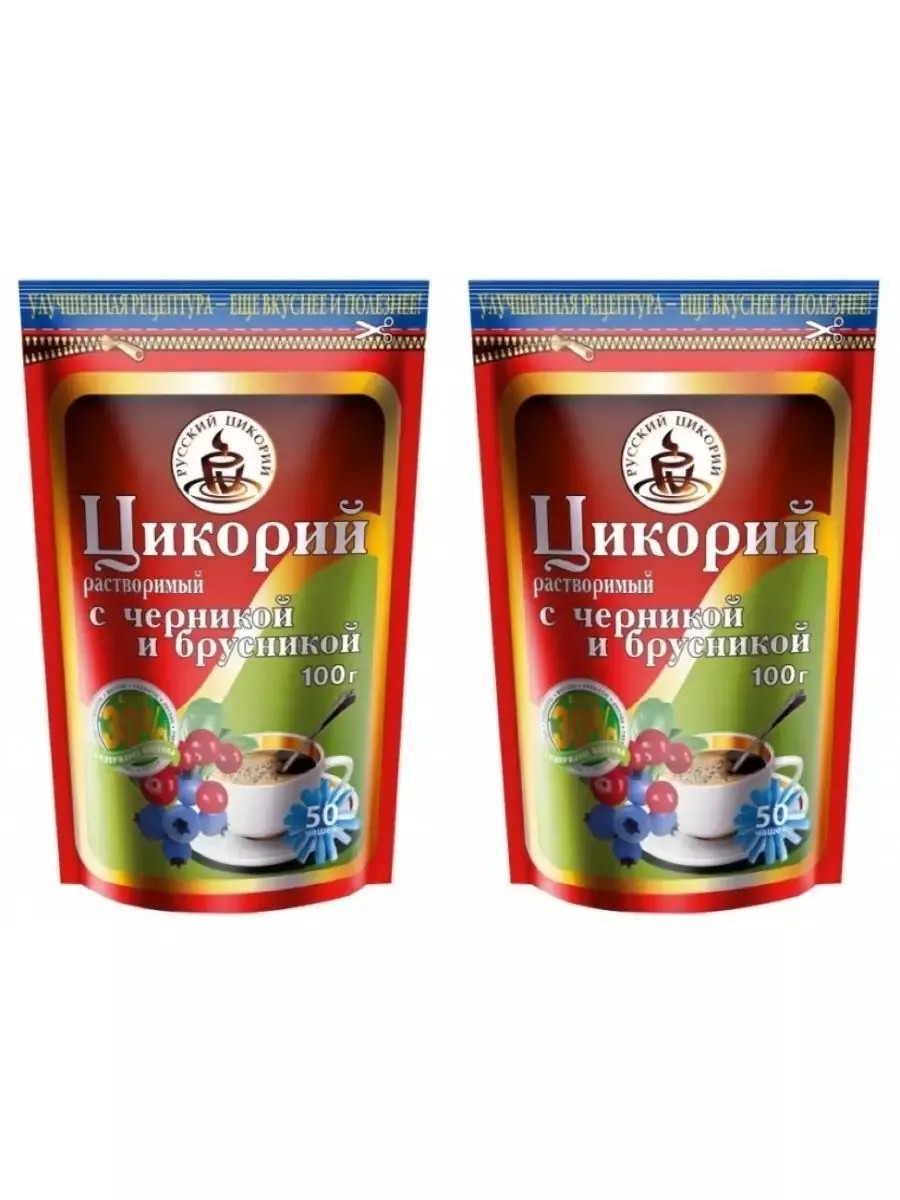 The set includes 2 packages. Total weight: 200 grams. Russian chicory, Instant chicory with blueberries and lingonberries. Instant powdered chicory with blueberries and lingonberries is completely similar to instant coffee in appearance and preparation method, and is very convenient to use. Chicory with blueberries and lingonberries is also very healthy, as blueberries are rich in sugar, malic, citric, and quinic acids, vitamin C, tannins, and pectin, while lingonberries are recommended as a diuretic, astringent, and antiseptic.