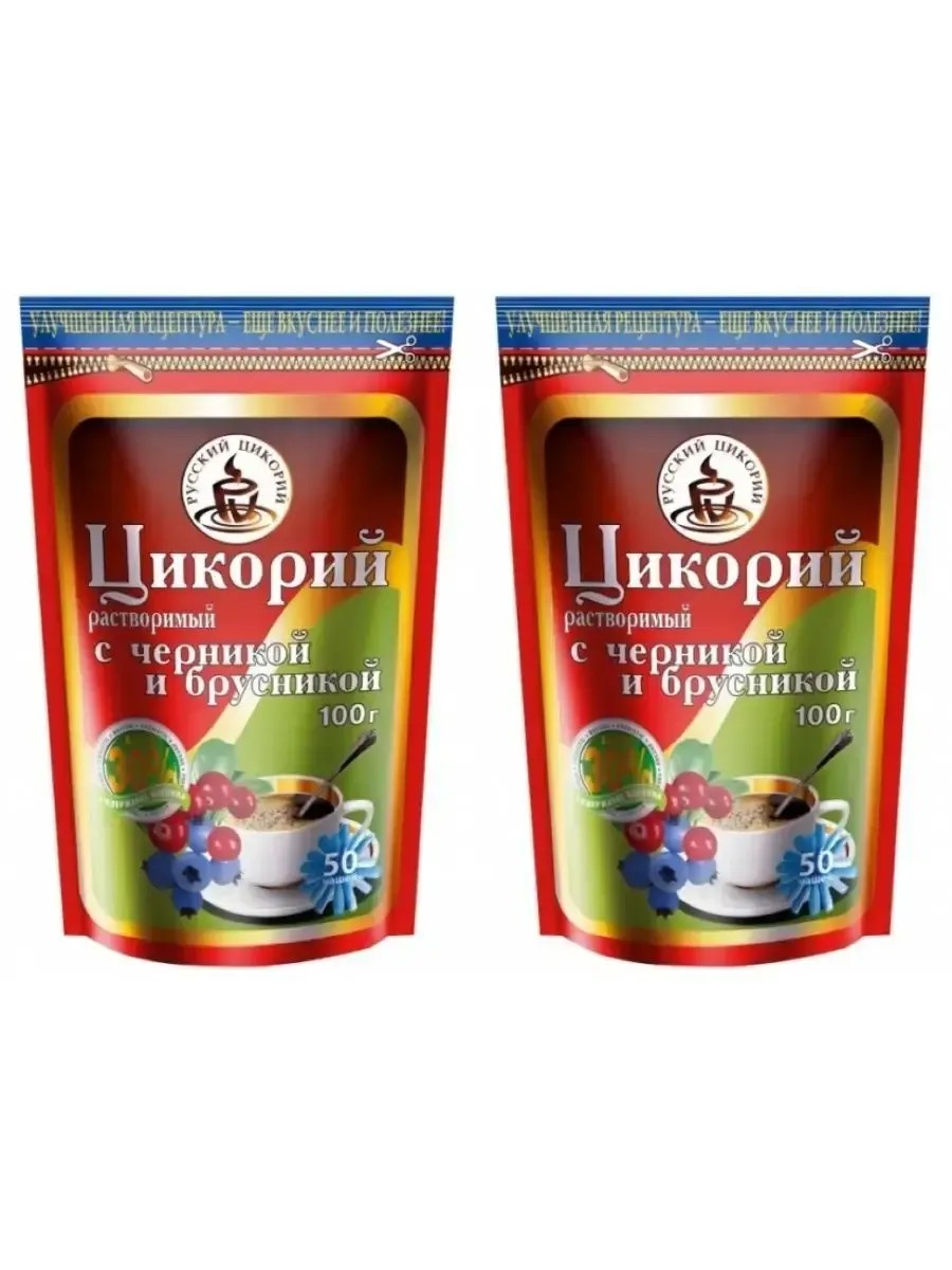 В комплекте 2 упаковки. Общий вес комплекта 200 гр. Русский цикорий, Цикорий растворимый с черникой и брусникой. Растворимый порошкообразный цикорий с черникой и брусникой, по виду и способу приготовления полностью аналогичен растворимому кофе, очень удобен в использовании. Кроме того, цикорий с черникой и брусникой очень полезен, ведь ягоды черники богаты сахаром, яблочной, лимонной и хинной кислотами, витамином С, дубильными и пектиновыми веществами, а брусника рекомендуется как мочегонное средство, вяжущее, антисептическое средство.