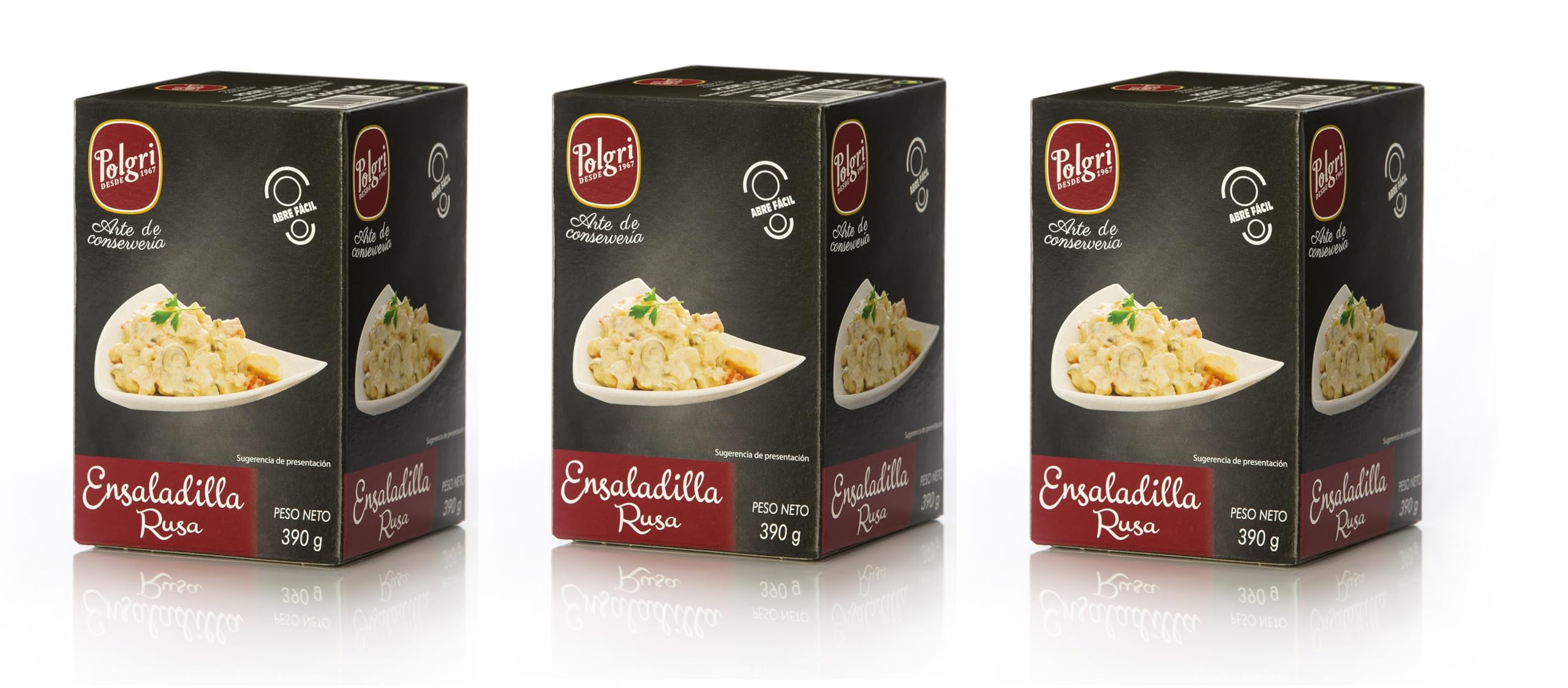 Russian salad, ideal for tapas, portions and side dishes. Serve very cold.Instructions: Serve very cold. It can be used as a base for other salads. Best before: Five years from the date of manufacture. Storage: In a cool, dry, dark place. Format: 425 ml round metal can with easy opening in a cardboard sleeve. Ingredients: Mayonnaise (water, sunflower oil, whole egg, wine vinegar, citric acid, sugar, salt, stabilizers (E-412, E-415), preservative E-202), potato (27 ), carrot (13 ), green beans (5 ), peas (5 ), tuna (1 ) and olives (0.5 ). Salade russe, idéale pour les tapas, les portions et les accompagnements. Servir très froid.Mode d'emploi: Servir très froid. Il sert de base à d'autres salades. Date de consommation préférée: Cinq ans à compter de la date de fabrication. Stockage: dans un endroit frais, sec et à l'abri de la lumière. Format: Bidon rond en métal de 425 ml. avec ouverture facile dans un étui en carton. Ingrédients: Mayonnaise (eau, huile de tournesol, œuf entier, vinaigre de vin, acide citrique, sucre, sel, stabilisants (E-412, E-415), conservateur E-202), pomme de terre (27 ), carotte (13 ), vert haricots (5 ), pois (5 ), thon (1 ) et olives (0,5 ).