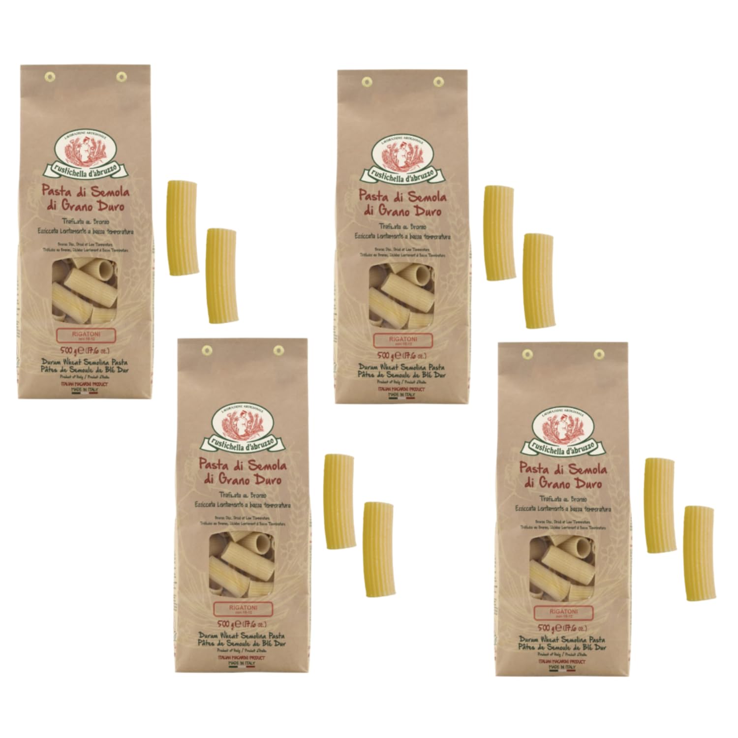 RUSTICHELLA D'Abruzzo since 1924: a story of pasta and family. For us, producing pasta is an ancient art, a heritage of our land's history and culture. Proud to be Italian, we bring Abruzzo pasta to the world. Constantly engaged in research, process monitoring, and quality control, Rustichella d'Abruzzo is at the forefront of pasta and food product development that meets consumer needs. Rigatoni: durum wheat semolina pasta, bronze-extruded and slowly dried at low temperature (4 x 500 grams). Made in Italy. [INNOVATION] - Rustichella d'Abruzzo is at the forefront of developing pasta and food products that meet consumer needs. The company has an in-house laboratory, enabling it to develop various innovative activities and optimize the production process. [PRODUCTION] - The production facilities are the lifeblood of the company. Here, the Sergiacomo recipe continues to thrive, maintaining the same quality and passion as in 1924. Craftsmanship as the driving force behind technology, a recipe dictated by tradition. [THE SEMOLE] - Between artisanal and industrial pasta lies a vast difference that is felt throughout the palate. Rustichella di Abruzzo uses only the finest selected hard grains, with a higher gluten content, kneaded with pure mountain water to give the pasta a unique flavor and tenacity. [THE PROCESS] - The precious bronze dies create the perfect rough texture in the pasta to absorb all types of seasonings. The drying process is slow and carried out at low temperatures, sometimes up to 50 hours and around 35-40 degrees Celsius. [THE STORY] - It's a pen that brings to life the story of Rustichella from Abruzzo, now a renowned artisan pastry chef in over 70 countries worldwide. Gaetano Sergiacomo decided to create a pastry bearing his name and, for its dough, wanted a wheat that speaks of Abruzzo. INGREDIENTS Durum wheat semolina, water. Contains gluten.Rustichella d'Abruzzo Rigatoni Semoule blé dur taille classique Pâtes artisanales - 4 x 500 Gr Pâte séchée lente basse températureDESCRIPTION DU PRODUIT DESCRIPTION DU PRODUIT RUSTICHELLA D'Abruzzo depuis 1924, une histoire de pâtes et de famille. Pour nous, produire des pâtes est un art ancien, patrimoine d'histoire et de culture de notre terre. Fiers d'être italiens et amener la pâte des Abruzzes dans le monde. Constamment engagé dans des activités de recherche et de suivi de processus et de contrôle de qualité, Rustichella des Abruzzes est à la pointe du développement de pâtes et de formules alimentaires qui peuvent répondre aux besoins du consommateur. Rigatoni : pâte de semoule de blé dur, tréfilée au bronze et séchée lentement à basse température (4 x 500 grammes). Fabriqué en Italie. [INNOVATION] - Rustichella des Abruzzes est à la première ligne pour le développement de pâtes et de formules alimentaires qui peuvent répondre aux besoins du consommateur. L'entreprise dispose d'un laboratoire interne permettant ainsi de développer différentes activités d'innovation et d'optimiser le processus de production. [PRODUCTION] - Les sites de production sont les deux poumons de l'entreprise. Ici, la recette Sergiacomo continue à vivre tout en conservant la même qualité et passion que 1924. L'artisanat en tant que tige de la technologie, une recette dictée par la tradition. [LES SEMOLE] - Entre la pâte artisanale et la pâte industrielle il y a un abîme qui se ressent tout au long du palais. Rustichella des Abruzzes n'utilise que les meilleurs grains de grains durs sélectionnés, avec une teneur en gluten plus élevée, pétries à l'eau pure de montagne pour donner une saveur et une ténacité uniques à la pâte. [LA TRAVAILLEMENT] – Les précieuses entrelacées en bronze rendent la pâte rugueuse au bon endroit pour capturer tout type d'assaisonnement. Le processus de séchage s'effectue lentement et à basse température, même jusqu'à 50 heures et environ 35 40 degrés. [LA STORIA] - C'est un stylo qui prend vie l'histoire de Rustichella des Abruzzes, aujourd'hui pâtissier artisanal connu dans plus de 70 pays au monde. Gaetano Sergiacomo, décide de créer un pâtissier qui porte son nom et pour sa pâte veut un blé qui parle des Abruzzes INGRÉDIENTS Semoule de blé dur, eau Contient du gluten.